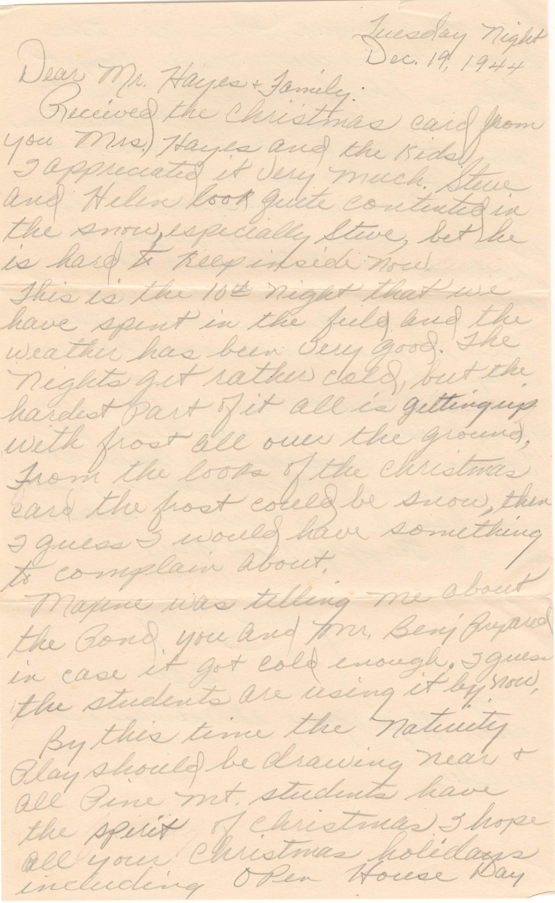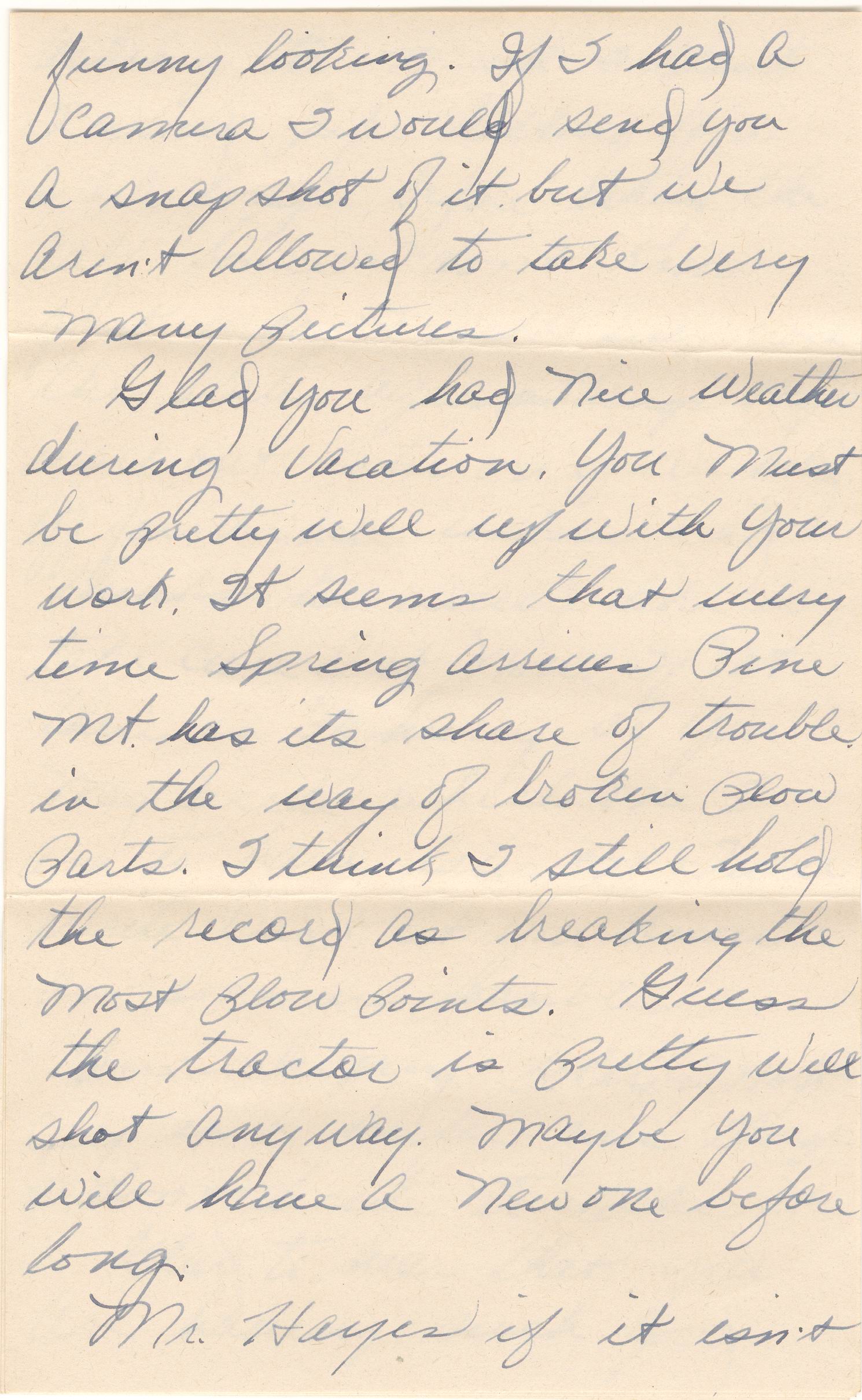 The letters of Bill Blair are addressed to William Hayes who was farm manager at Pine Mountain from 1937 until 1953. Hayes assumed the responsibilities for the farm shortly before his graduation from high school at Pine Mountain in 1937. Bill Blair was one of many students who worked on the farm crew at the School and under farmer Hayes. Bill Blair left in 1944 to join the war effort and was in training when he corresponded with Hayes. The letters contain much information about the farm program at the School, the disciplines learned in the program and the application of those disciplines in military service.