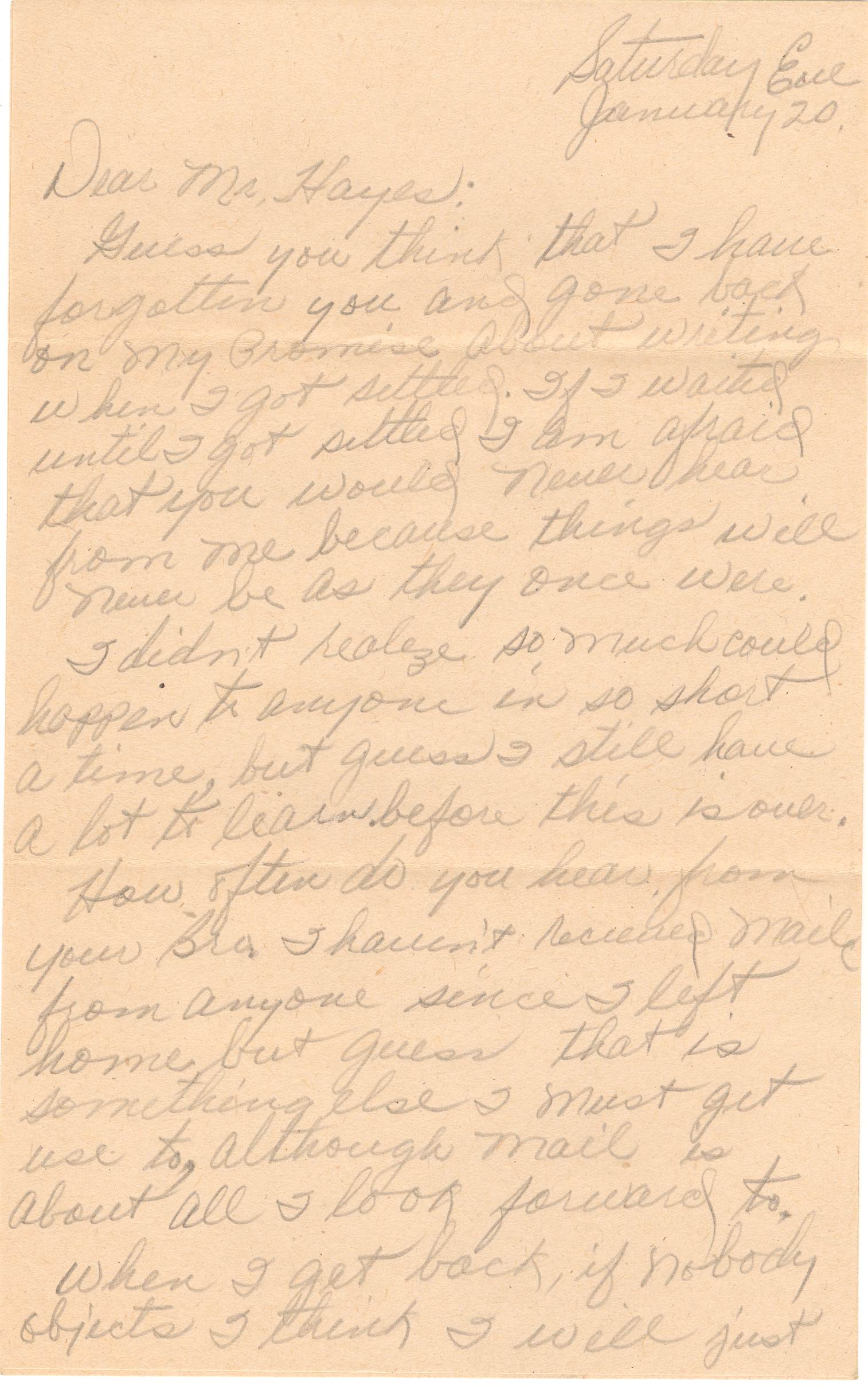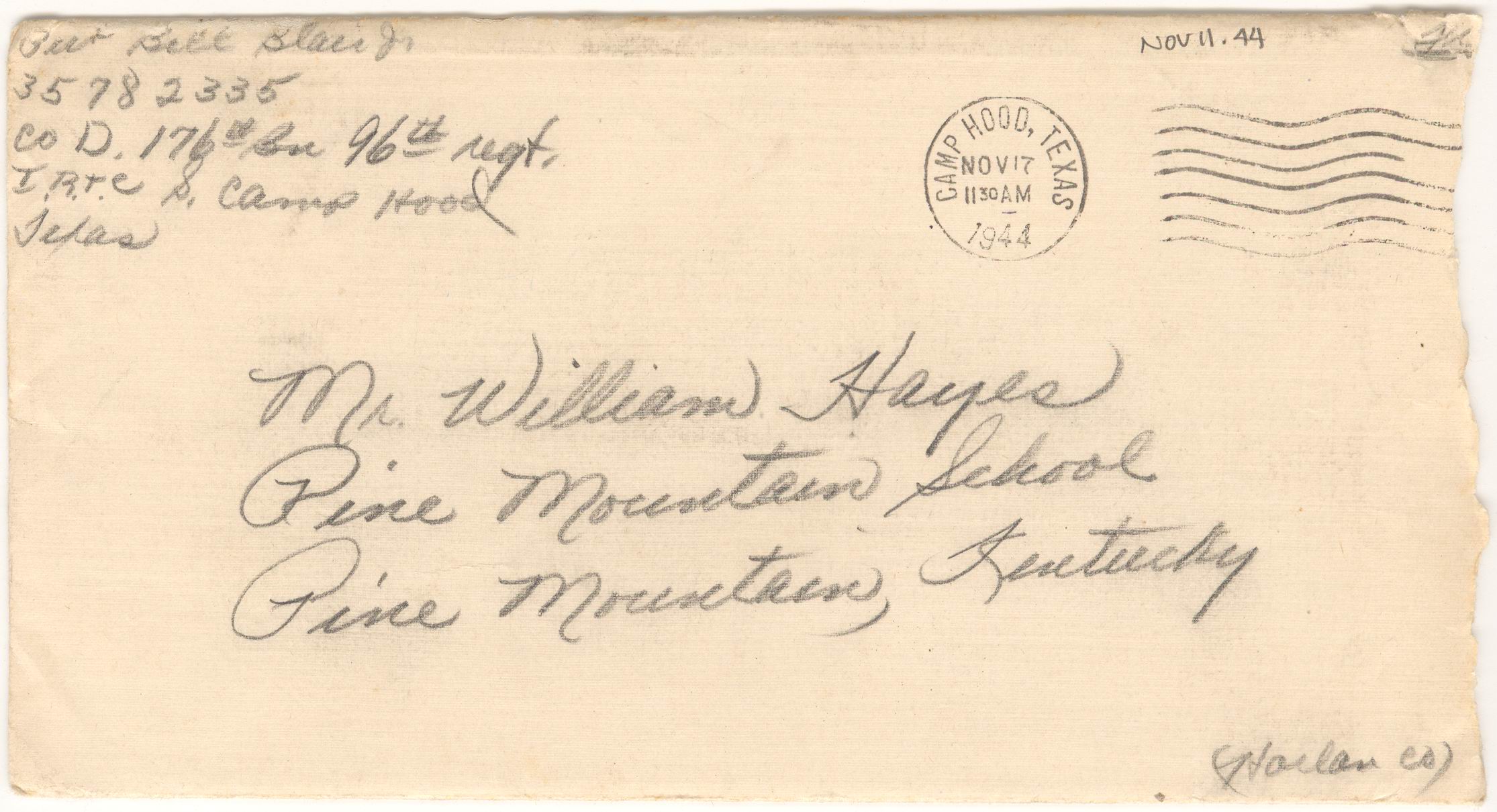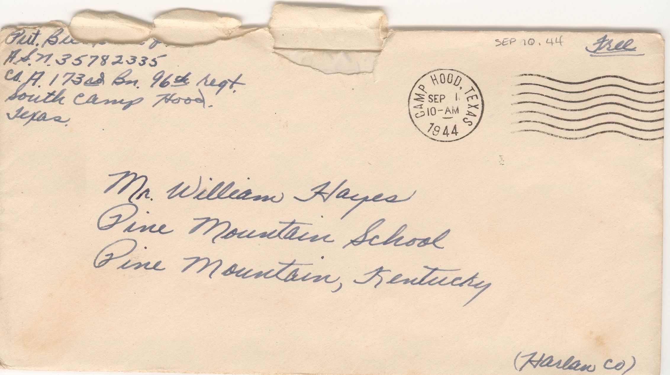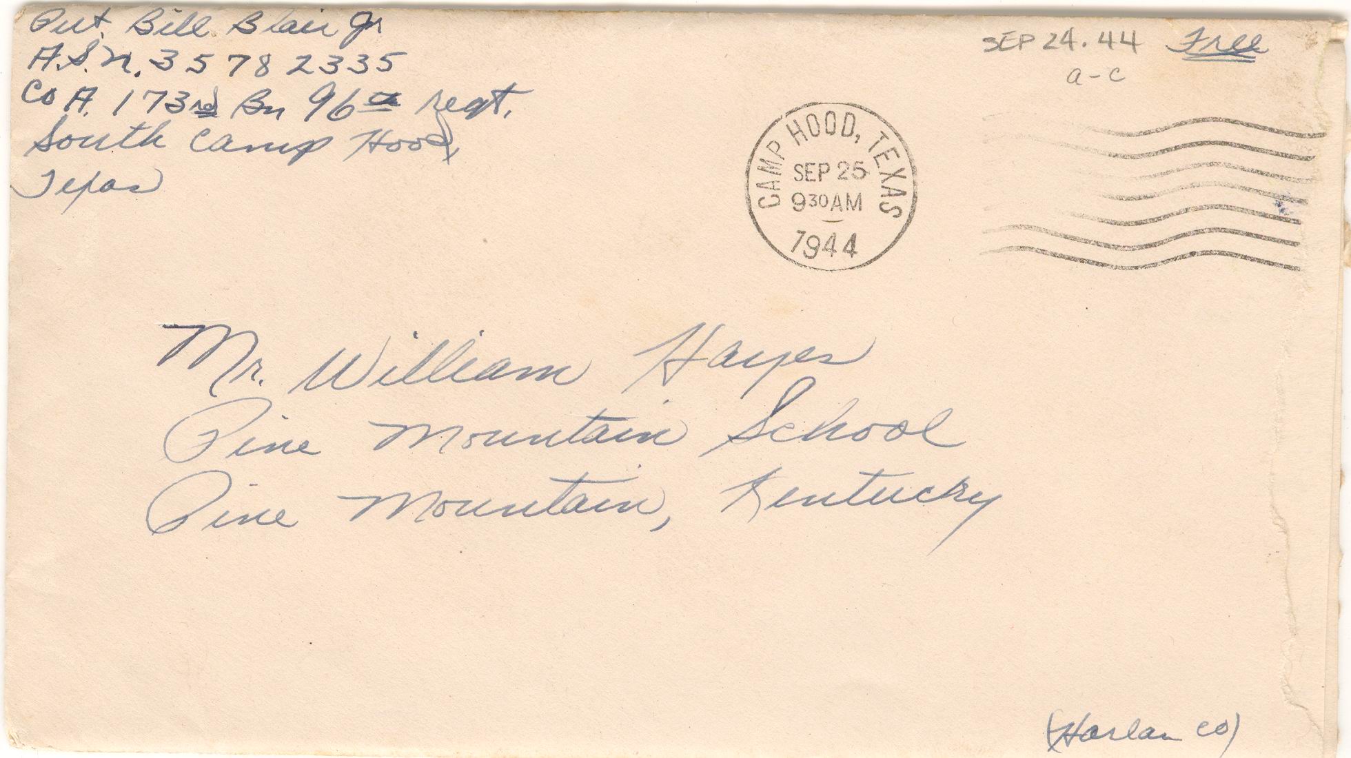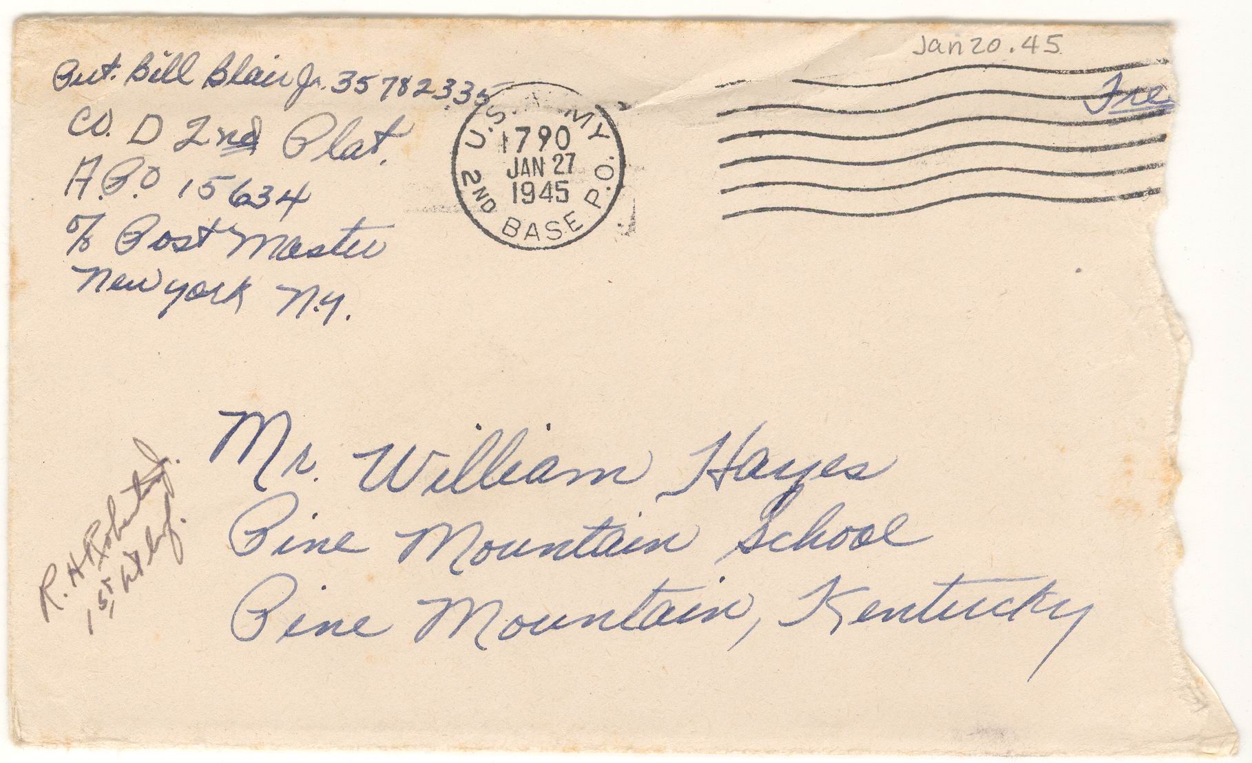 Two additional letters are included in the Blair letters that are not written by Blair but by classmates who shared the war experience. The two students are NOEL V. WELLS and “DAN” [BUCK JONES]. A note on the reverse of the Jones letter remembers that he was from Coxton, Kentucky, the mining town where Bill Hayes was from and was an usher at the wedding of Fern and Bill and a “swimming buddy” of Bill’s. [The note is in the hand of Fern Hayes, Bill Hayes’ wife.]