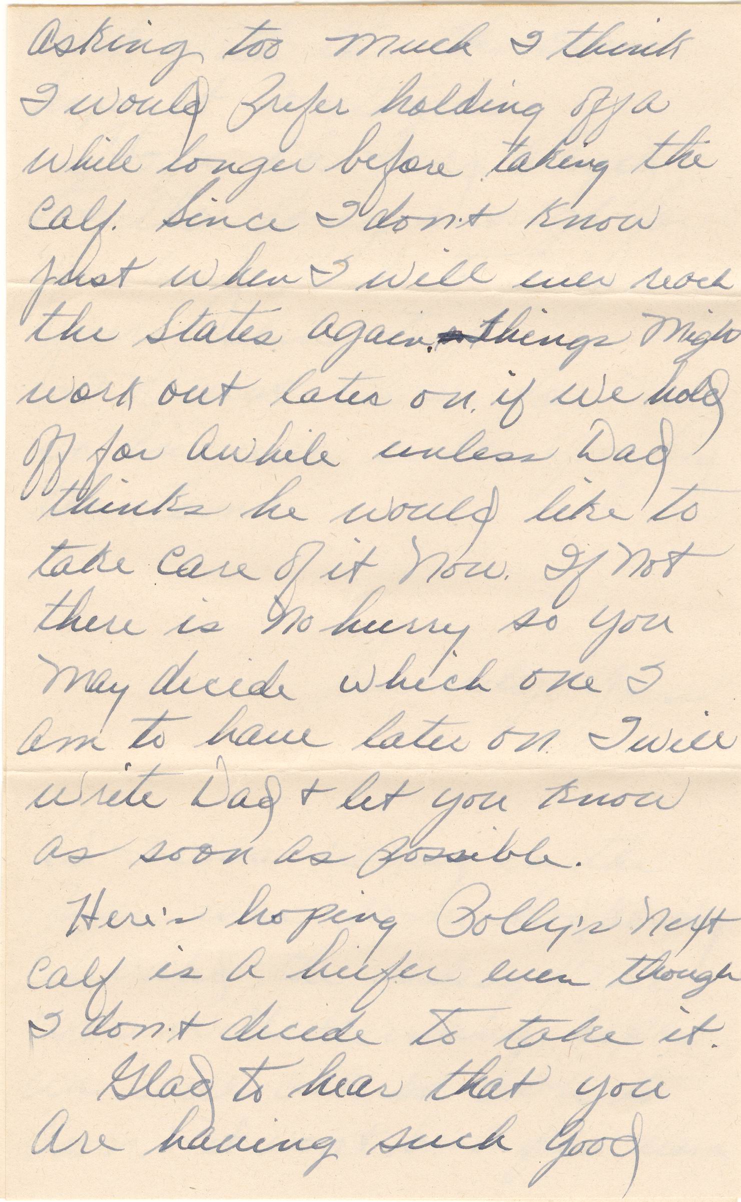 Dad has been telling me what a fine calf I have. I still feel that I owe you something for it