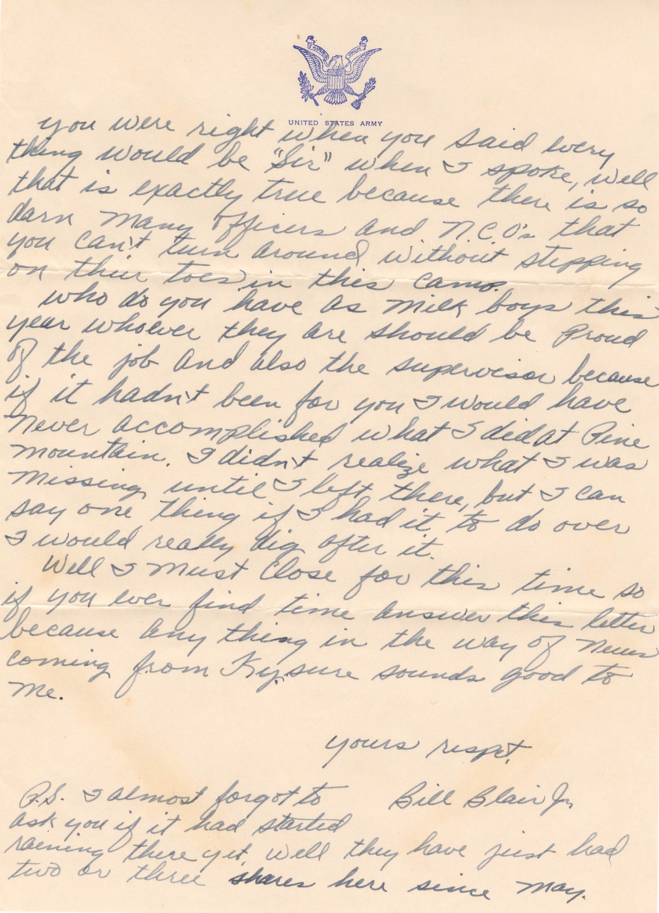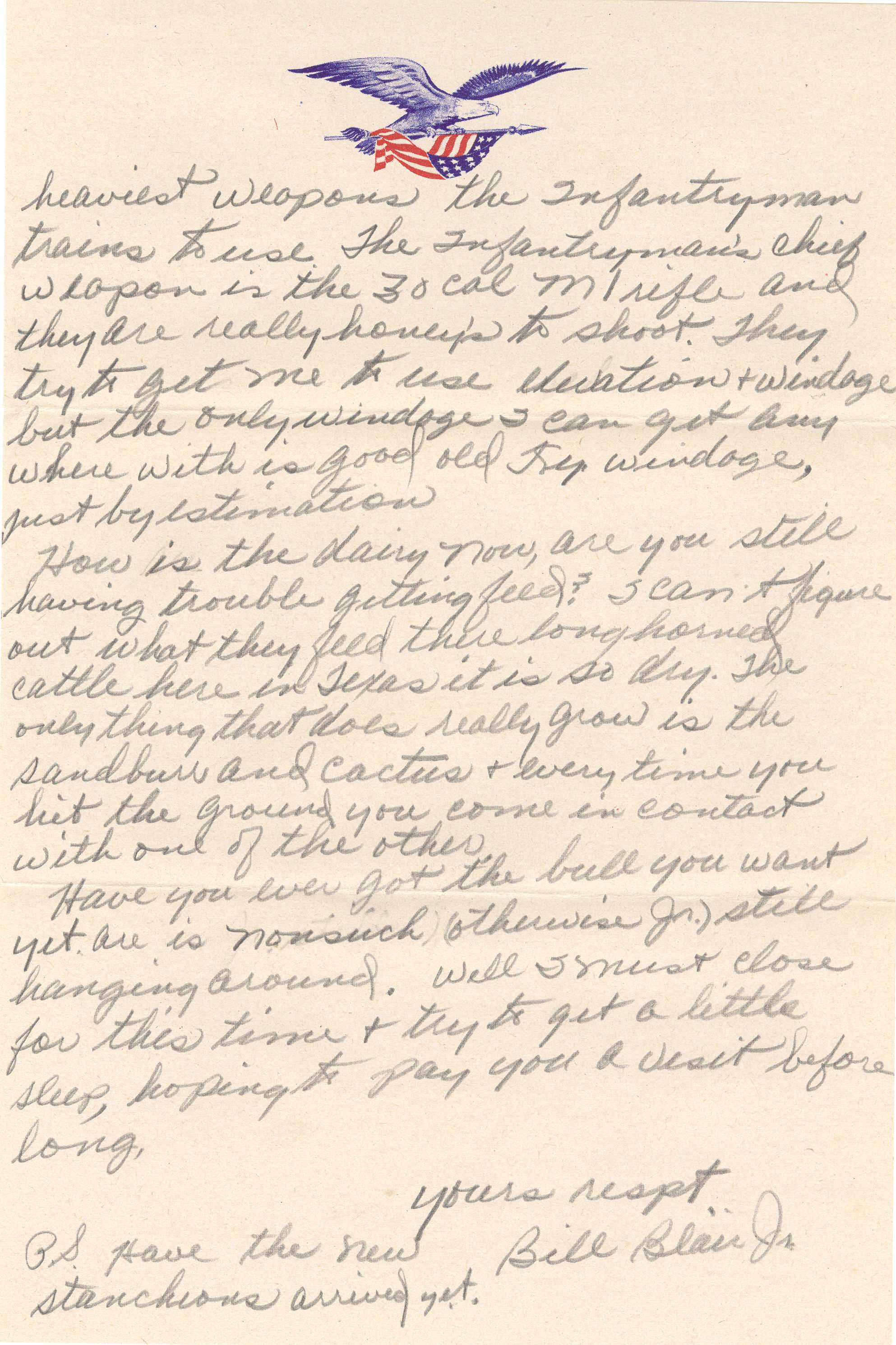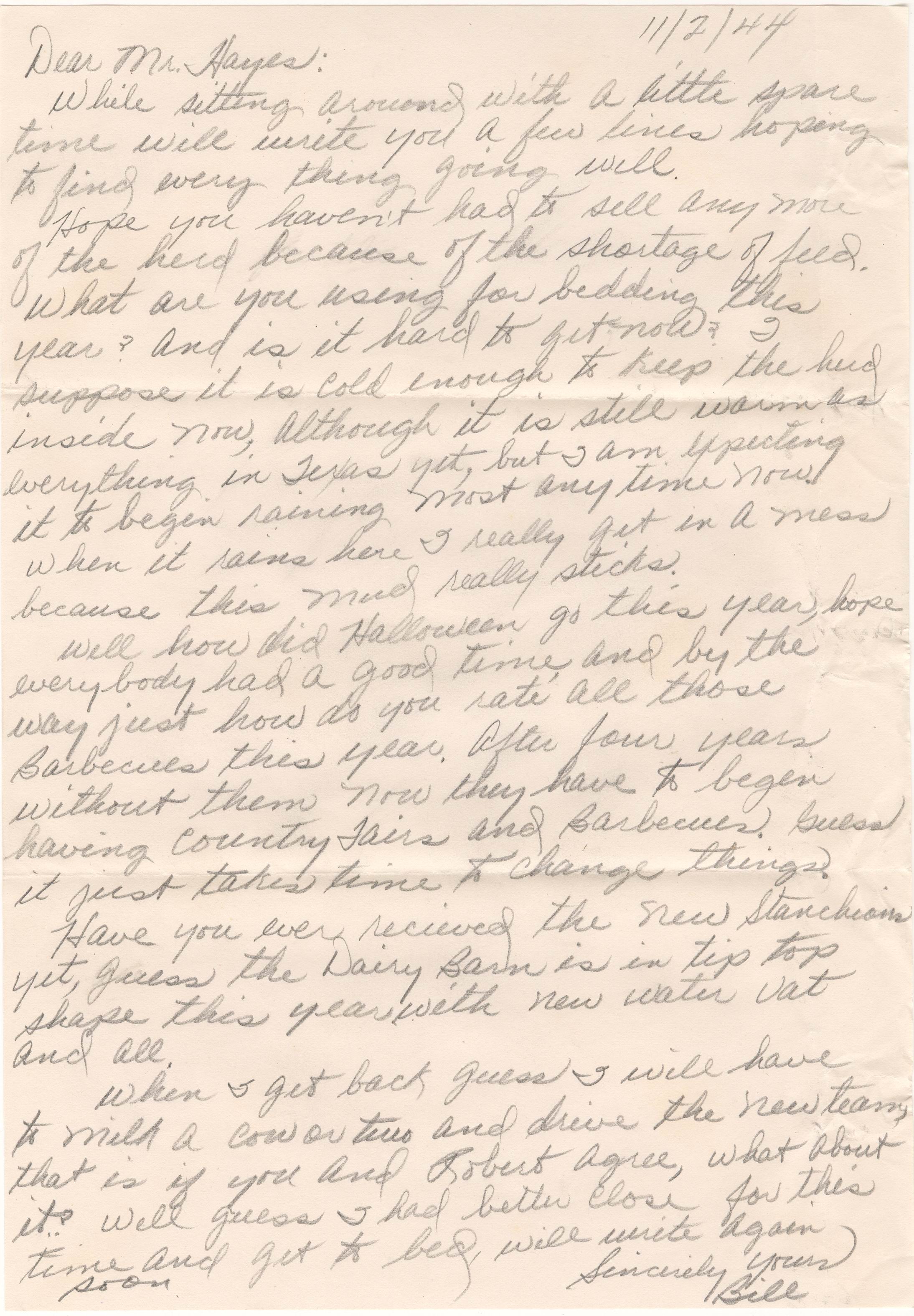 TAGS: William Blair, Bill Blair, WWII letters, William Hayes, farms, farming, cows, dairy, war, military training, work program