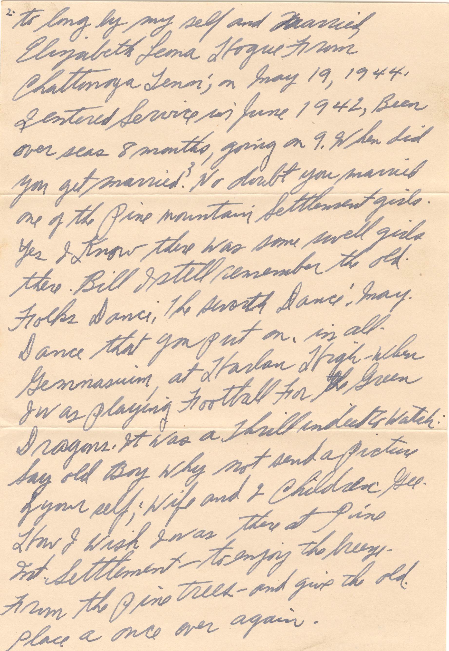 children as its hello. All I do is think of my wife in Knoxville, Tenn. Yes–I decided I had roamed around to[o] long by my self and married Elizabeth Lema Hogue from Chattanooga, Tenn on May 19, 1944. I entered Service in June 1942. Been over seas 8 months, going on 9. When did you get married? No doubt you married one of the Pine Mountain Settlement girls. Yes I know there was some swell girls there. Bill I still remember the old folks dance, the worth dance; May