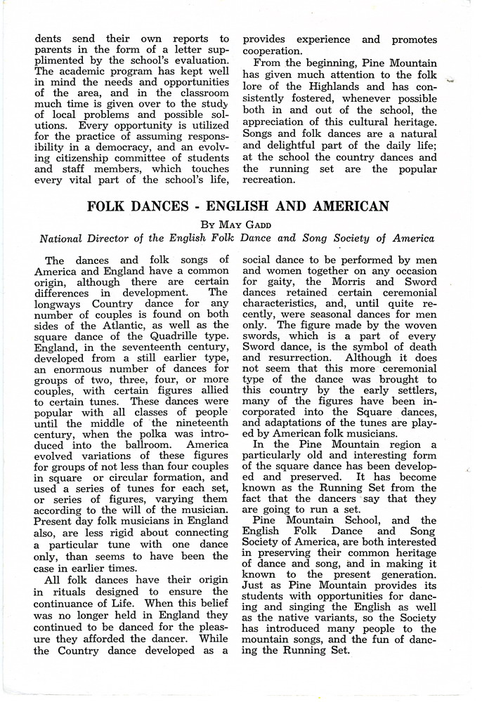 Even in far away England this summer we saw a demonstration, by young English people, of a folk dance seen and recorded for the first time at Pine Mountain nearly twenty years ago.