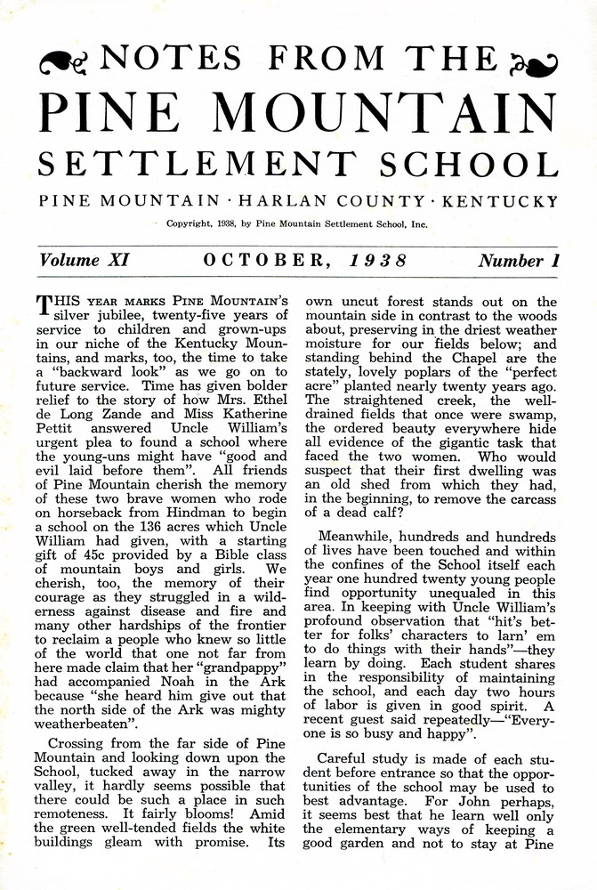 NOTES – 1938 SILVER JUBILEE EDITION: Silver Jubilee 1913-1938 ; Hindman Settlement ; religion ; recreation ; swimming pool ; Pine Mountain Health Association ; camp ; athletics ; Ethel de Long Zande ; Katherine Pettit ; Uncle William ; May Gadd ; John A. Spelman III ; linoleum cuts ;
