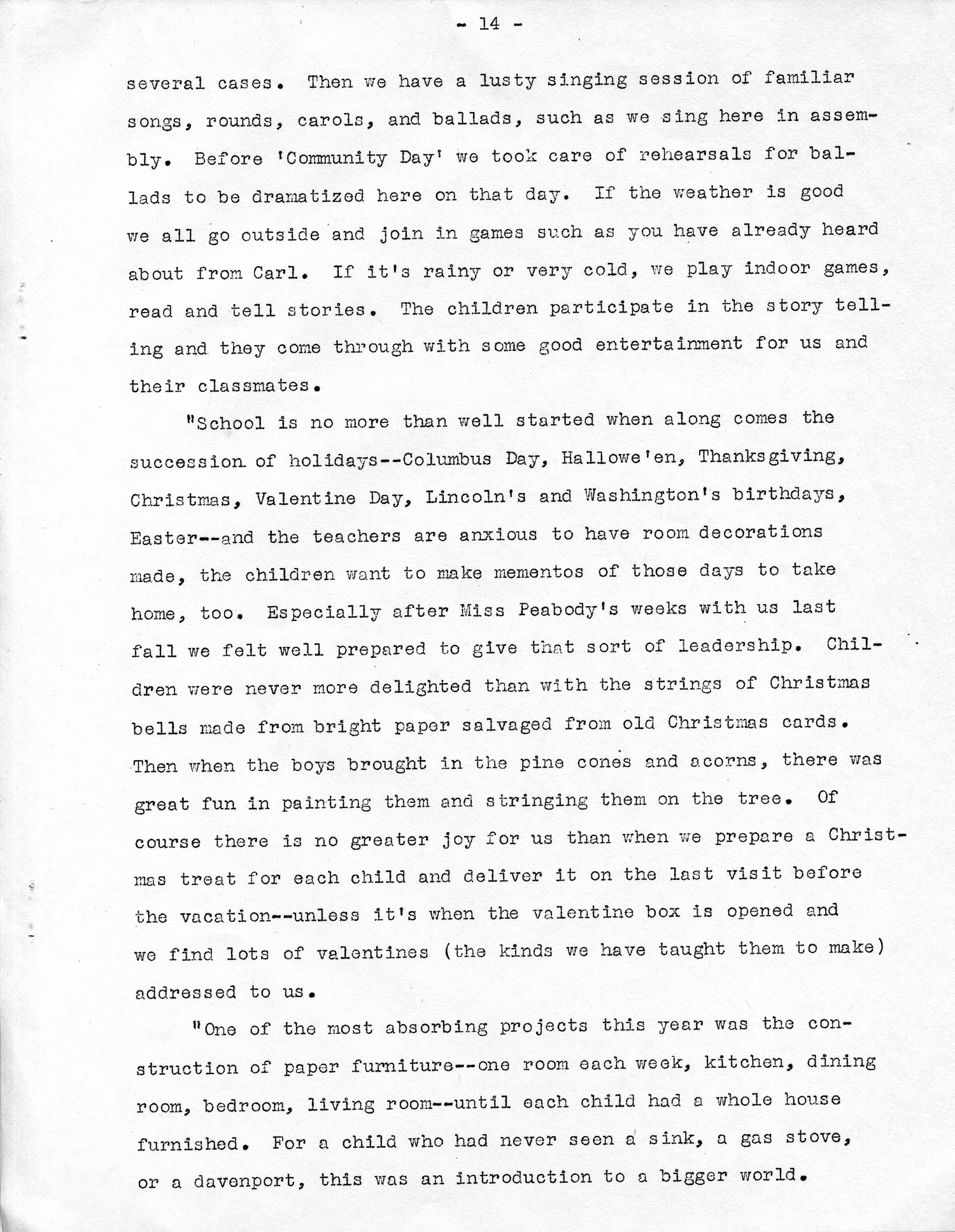 “School is no more than well started when along comes the succession of holidays — Columbus Day, Hallowe’en, Thanksgiving, Christmas, Valentine Day, and Lincoln’s and Washington’s birthdays, Easter — and the teachers are anxious to have room decorations made, the children want to make mementos of those days to take home, too. Especially after Miss Peabody’s weeks with us last fall, we felt well prepared to give that sort of leadership. Children were never more delighted than with the strings of Christmas bells made from bright paper salvaged from old Christmas cards. Then when the boys brought in the pine cones and acorns, there was great fun in painting them and hanging them on the tree. Of course there is no greater joy for us than when we prepare a Christmas treat for each child and deliver it on the last visit before the vacation — unless it’s when the valentine box is opened and we find lots of valentines (the kinds we have taught them to make) addressed to us.