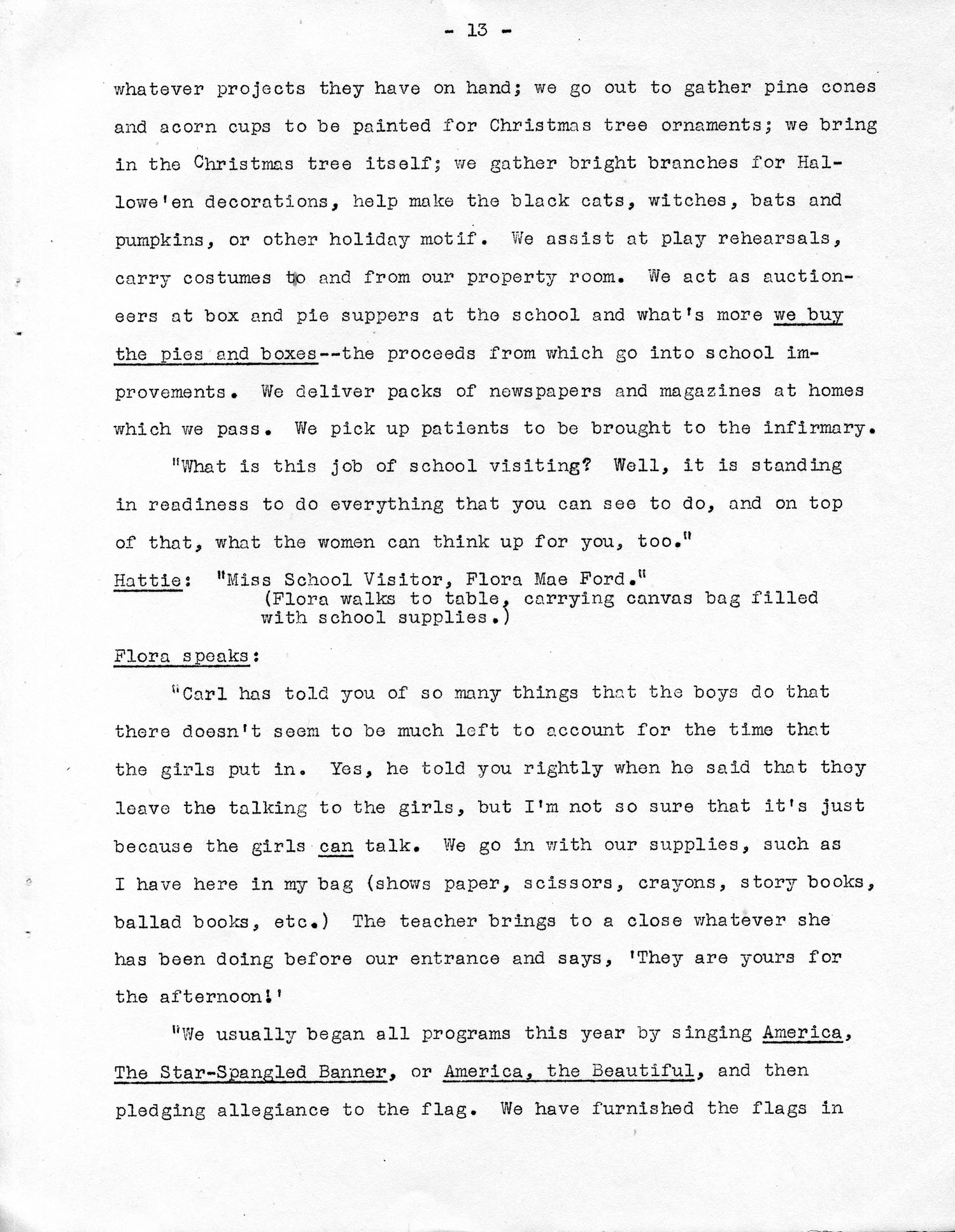 “Carl has told you of so many things that the boys do that there doesn’t seem to be much left to account for the time that the girls put in. Yes, he told you rightly when he said that they leave the talking to the girls, but I’m not so sure that is just because the girls can talk. We go in with our supplies, such I have here In my bag (shows paper, scissors, crayons, books, ballad books, etc.) The teacher brings to a close whatever she has been doing before our entrance and says, ‘They are yours for the afternoon!’