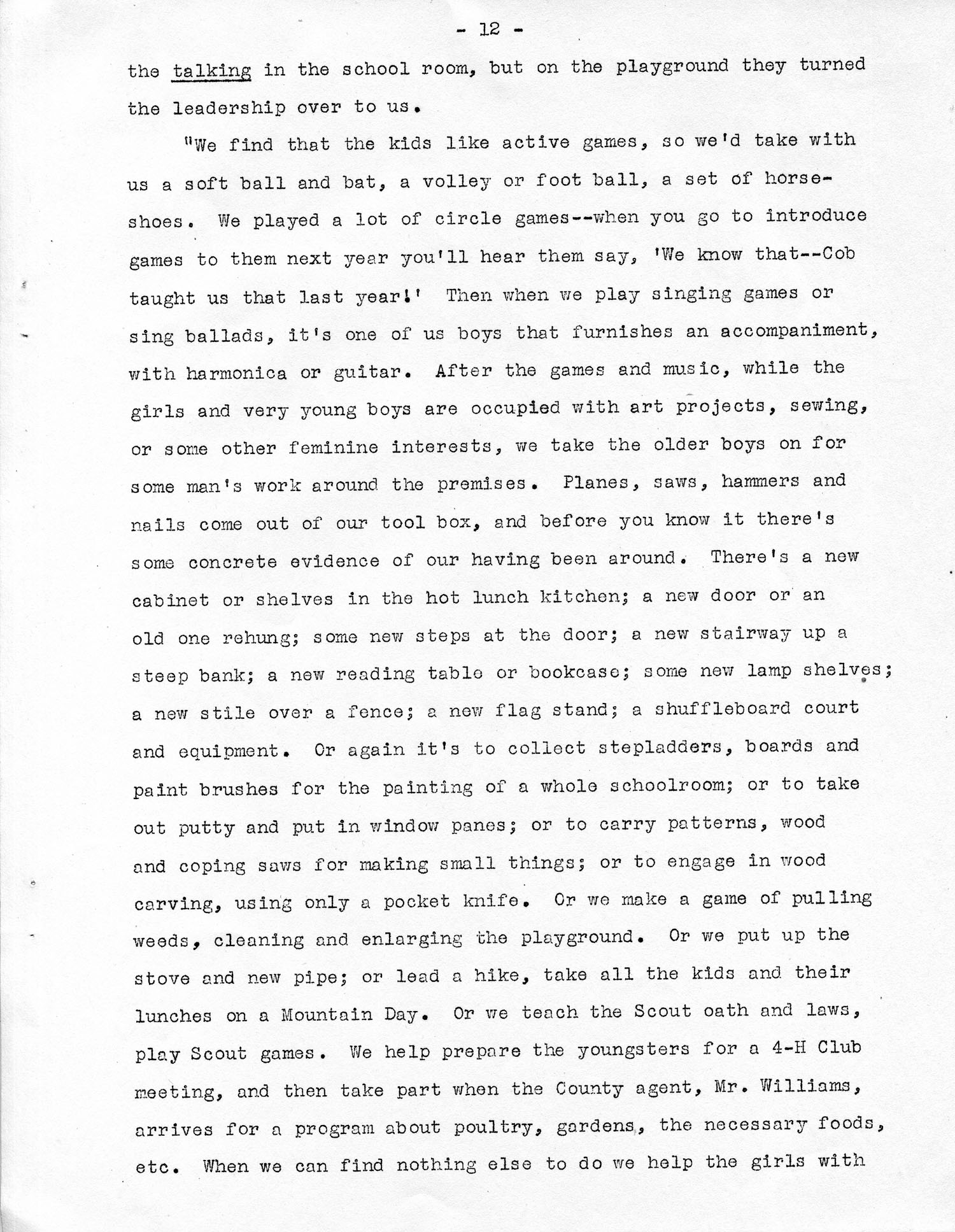 “We find that the kids like active games, so we’d take with us a soft ball and bat, a volley or foot ball, a set of horseshoes. We played a lot or circle games — when you go to introduce games to them next year you’ll hear them say, ‘We know that — Cob [Tye Cob?] taught us that last year!’ Then when we play singing games or sing ballads, it’s one of us boys that furnishes an accompaniment, with harmonica or guitar. After the games and music, while the girls and very young boys are occupied with art projects, sewing, or other feminine interests, we take the older boys on for some man’s work around the premises. Planes, saws, hammers, and nails come out of our tool box, and before you know It there’s some concrete evidence of our having been around. There’s a new cabinet or shelves in the hot lunch kitchen; a new door or an old one rehung; some new steps at the door; a new stairway up a steep bank; a reading table or bookcase; some new lamp shelves; a new stile over a fence; a new flag stand; a shuffleboard court and equipment. Or, again, it’s to collect stepladders, boards and paint brushes for the painting of a whole schoolroom; or to take out putty and put in window panes; or to carry patterns, wood and coping saws for making things; or to engage in wood carving, using only a pocket knife. Or we make a game of pulling weeds, cleaning and enlarging the playground. Or, we put up the stove and new pipe; or lead a hike, take all the kids and their lunches on a Mountain Day. Or we teach the Scout oath and laws, [and] play Scout games. We help prepare the youngsters for a 4-H Club meeting, and then take part when the County agent, Mr. Williams, arrives for a program about poultry, gardens, the necessary foods, etc. When we can find nothing else to do we help the girls with…