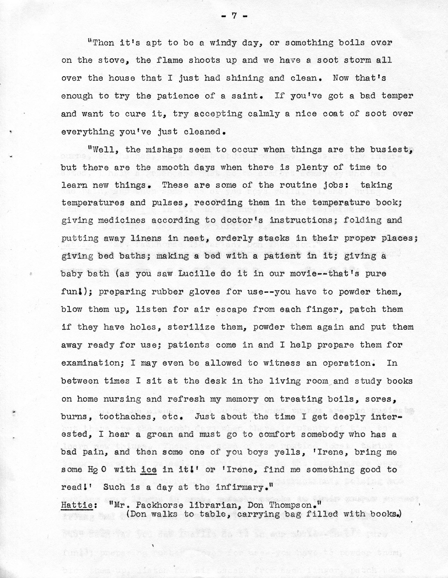 “We go by way of the kitchen door. Miss Rood pokes her head out of the living room, ‘Thank goodness you are here, Irene! We’ve got an overflow of patients and we must do a lot of shiftIng around.’ I find that a pneumonia patient has come In and has to be isolated, two or three babies have arrived, so instead of keeping one mother alone in the maternity ward, they must be put together in the front ward; then they can talk and compare notes on their beautiful new offspring. Well, If any of you two hefty boys (flexes arm) have ever tried gently moving sick persons up or downstairs, then you can appreciate Miss Rood’s and my strong backs. (Leans back, hand on back at waist.)