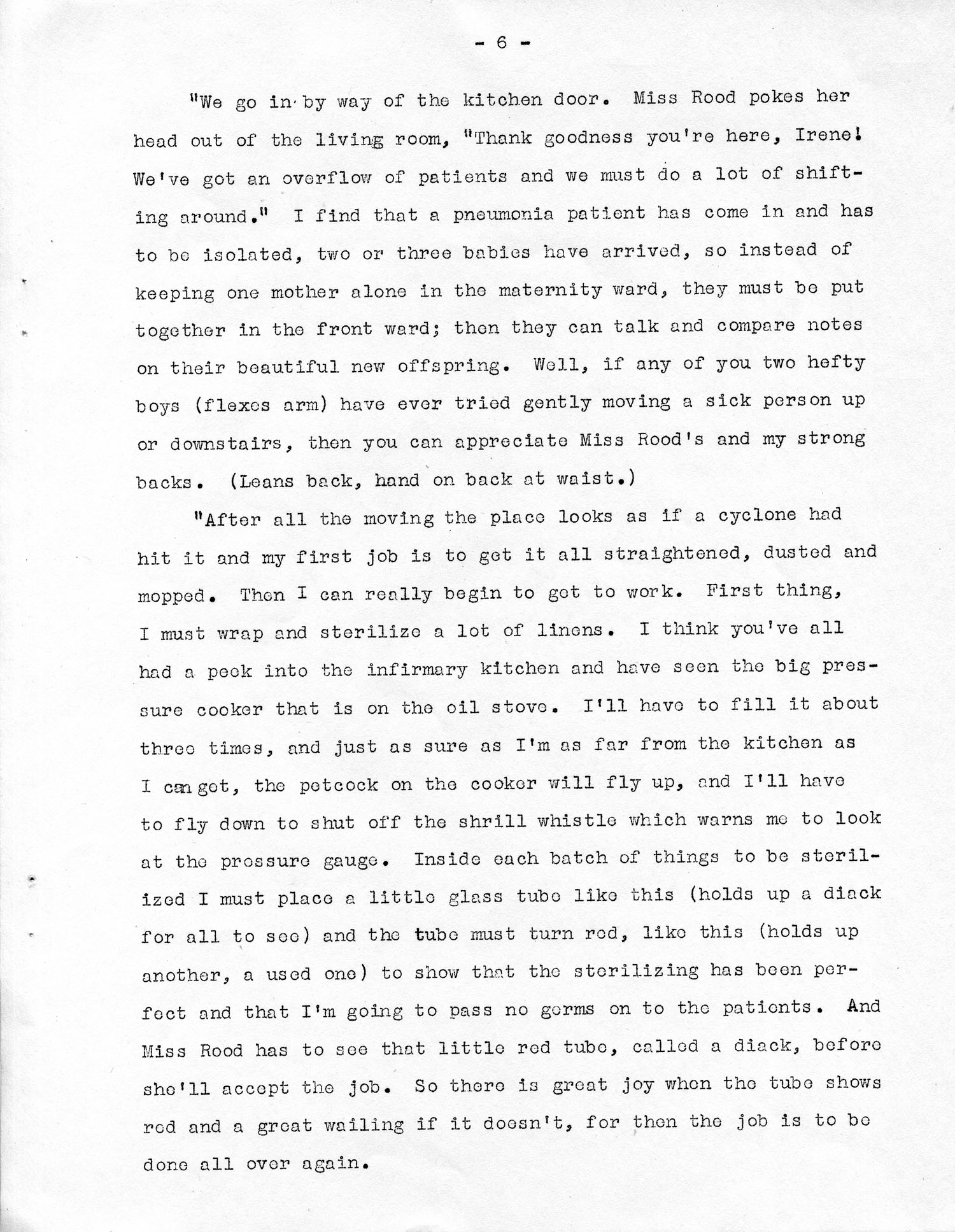 “After all the moving the place looks as a cyclone had hit It and my job is to get it straightened, dusted and mopped. Then, I can really to get to work. First thing, I must wrap end sterilize a lot of linens. I think you’ve all had a peek into the infirmary kitchen and have seen the big pressure cooker that is on the oil stove. I’ll have to fill it about three times, and just as sure as I’m as far from the kitchen as I can get, the potcock on the cooker will fly up, and I’ll have to fly down to shut off the shrill whistle which warns me to look at the pressure gauge. Inside each batch of things to be sterilized I must place a little glass tube like this (holds up a diack** for all to see) and the tube must turn red, like this (holds up another, a used one) to show that the sterilizing has been perfect and that I’m going to pass no germs on to the patients. And Miss Rood has to see that little red tube, called a ‘diack,’ before she’ll accept the job. So there is great joy when the tube shows red and a great wailing if it doesn’t, for then the job is to be done all over again.