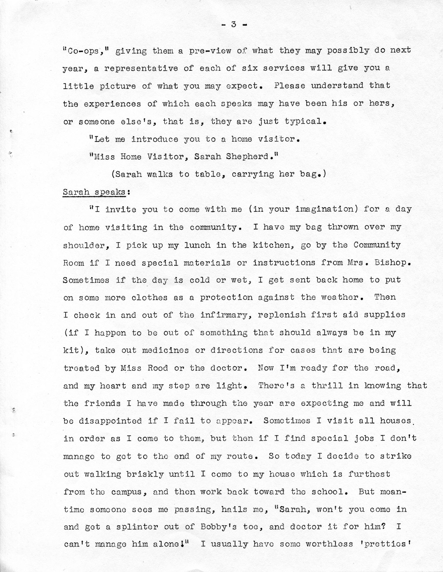 “I invite you to come with me (In your imagination) for a day of home visiting in the community. I have my bag thrown over my shoulder, I pick up my lunch in the kitchen, go by the Community Room if I need special materials or instructions from Mrs. [Berdina] Bishop. Sometimes if the day is cold or wet, I get sent back home to put on some more clothes as a protection against the weather. Then I check in and out of the Infirmary, replenish first aid supplies (If I happen to be out of something that should always be in my kit), take out medicines or directions for cases that are being treated by Miss [Grace] Rood or the doctor. Now I’m ready for the road, and my heart and my step are light. There’s a thrill in knowing that the friends I made through the year are expecting me and will be disappointed if I fail to appear. Sometimes I visit all houses in order as I come to them, but then if I find special jobs I don’t manage to get to the end of my route. So today I decide to strike out walking briskly until I come to my house which is furthest from the campus and then work back toward the school. But meantime someone sees me passing, hails me, ‘Sarah, won’t you come in and get a splinter out of Bobby’s toe, and doctor It for him? I can’t manage him alone!’ I usually have some worthless ‘pretties’…