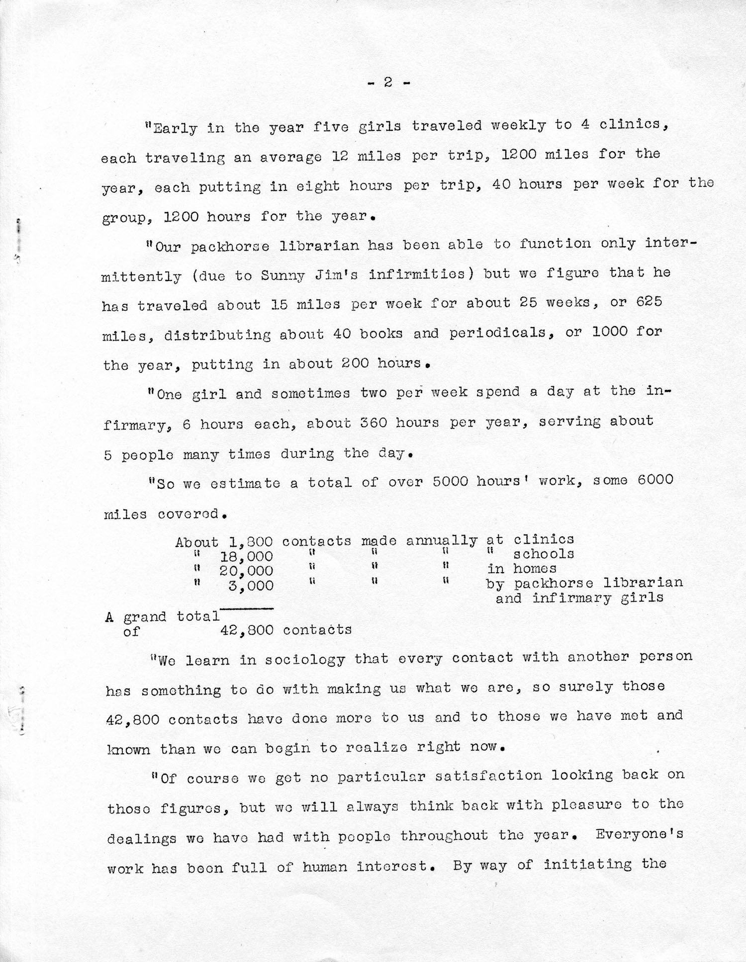 “Our packhorse librarian has been able to function only intermittently (due to Sunny Jim’s infirmities) but we figure that he has traveled about 15 miles per week for about 25 weeks, or 625 miles, distributing about 40 books and periodicals, or 1000 for the year, putting in about 200 hours.