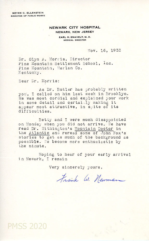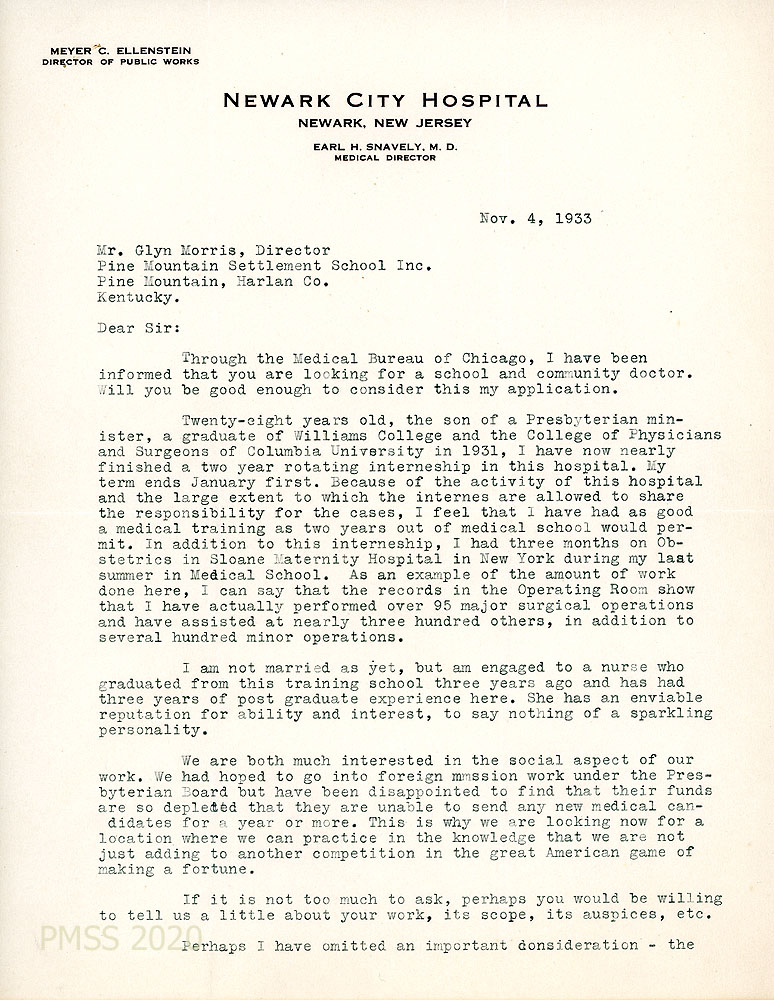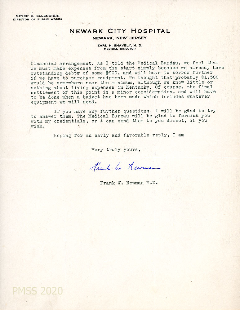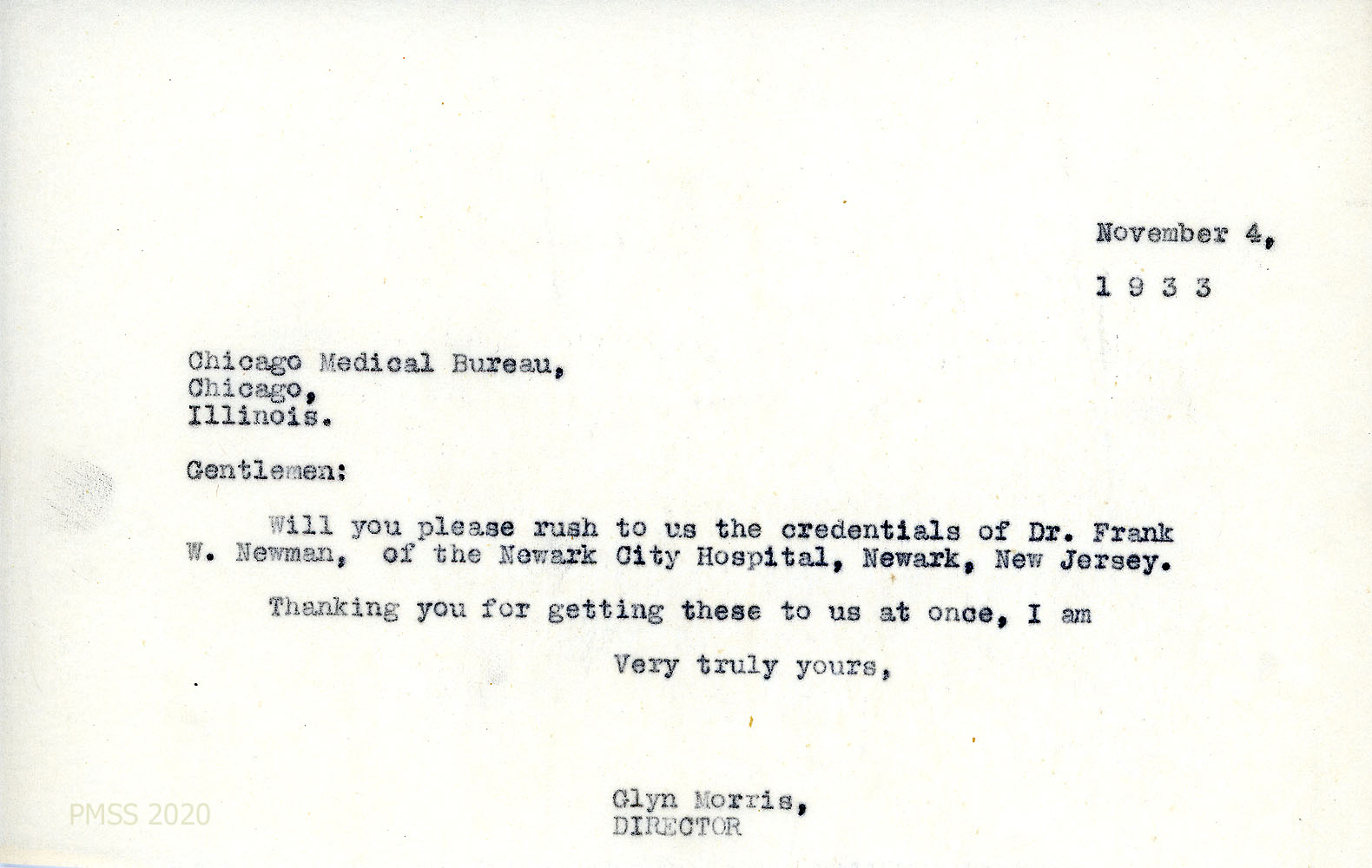 [001], [001a] November 4, 1933. To Glyn Morris, PMSS Director, from Frank W. Newman M.D. on Newark (NJ) City Hospital letterhead, [001] who learned from the Medical Bureau of Chicago that the School was looking for a doctor and asks Morris to consider his letter as his application. He is 28 years old; son of a Presbyterian minister; graduate of Williams College and the College of Physicians and Surgeons of Columbia University in 1931, where he is completing his internship; tells of additional training and his experience; engaged to a nurse. Asks for information about the work at PMSS. [001a] Describes his financial needs.
