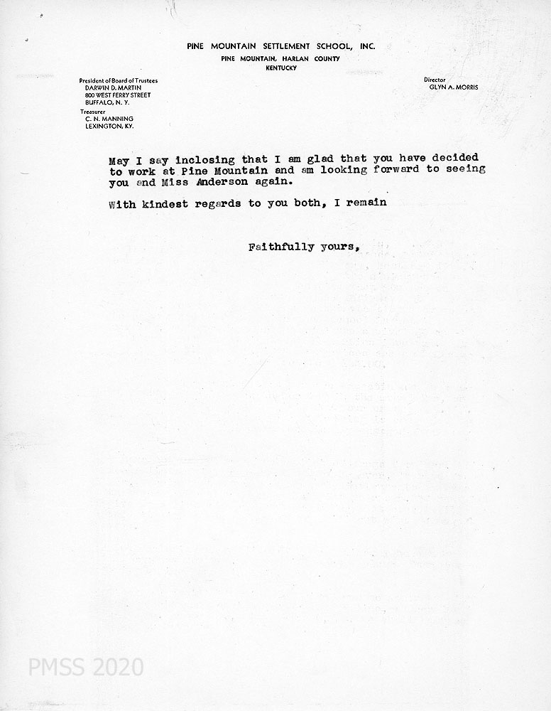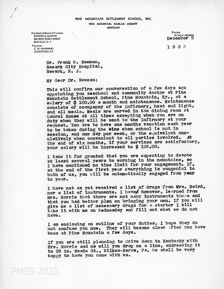 [010], [010a] December 2, 1933. Two-page letter to Newman from [unsigned, likely Morris], [010] confirming his appointment as school and community doctor at PMSS; salary $100 a month and maintenance, increased to $125 after six months if his work is satisfactory; describes what maintenance consists of and vacation and days off. After one year, if acceptable to both sides, he “will be automatically engaged from year to year.” Advises about drugs and instruments in the Infirmary; encloses an outline of his duties; asks his plans to ride to Kentucky with the Morrises. [010a] “I am glad that you have decided to work at Pine Mountain.”