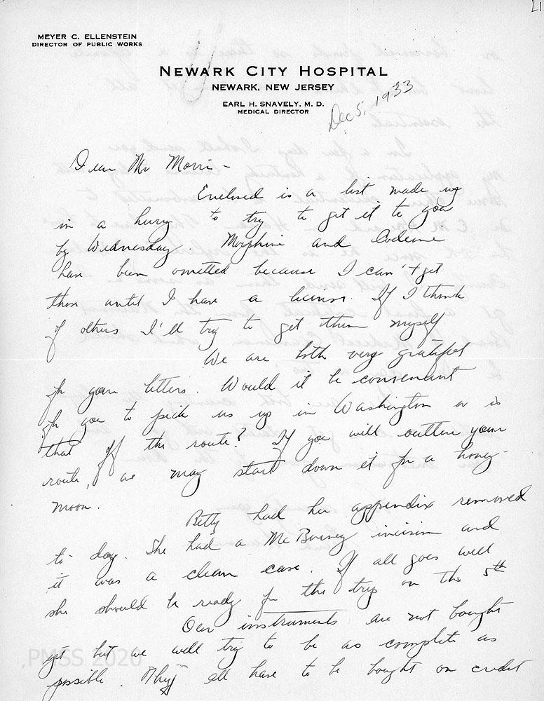 [011], [011a] December 5, 1933. Two-page handwritten letter to Morris from Newman on Newark (NJ) City Hospital letterhead, [011] sending a list of drugs; asks if they can be picked up in Washington; needs to buy his instruments. [011a] He will send his credentials and application for a Kentucky license to be submitted to Dr. E.M. Howard in Harlan.