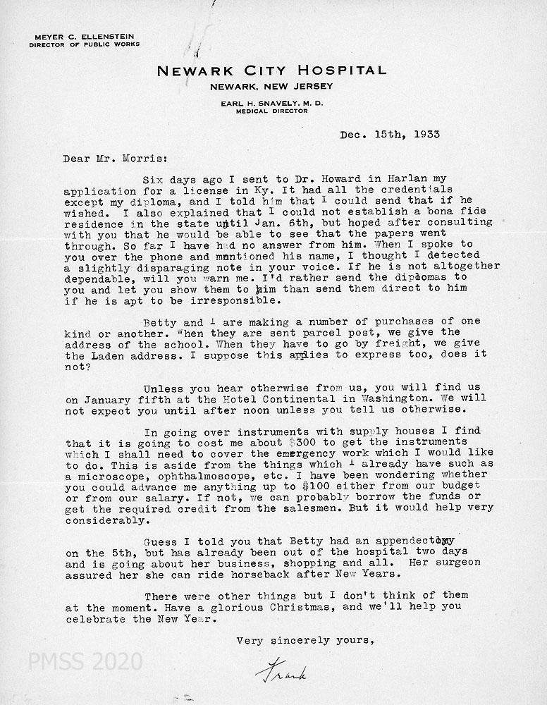 [012] December 15, 1933. To Morris from Newman, stating that he sent his credentials and application for a KY license to Dr. Howard and awaits his reply; will not establish a residence in KY until January 6; sending their purchases to PMSS (or Laden if by freight); arranges to be met in Washington; asks for an advance of $100 from their salary or budget to buy instruments.