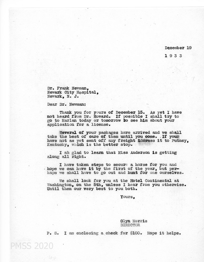 [013] December 19, 1933. To Newman from Morris, who will check with Dr. Howard; some of Newman’s packages have arrived; send freight to Putney, KY, a “better stop”; may have a horse for Newman; encloses a $100 check.