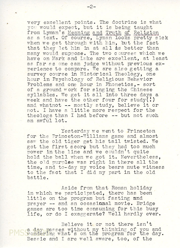 [017], [017a], [017b] October 13, [no year]. Three-page letter to “Glyn, Old Thing” from “Frank” in Plainfield, NJ, [017, page 1] who tells about his and Betty’s health, and that “Bessie” received a letter from Mrs. [Barbara] Faulkner about the Diesel. [017a, page 2] Describes his courses in religion; a Princeton-Williams game he attended. He and Bessie think of Morris daily. [017b, page 3] Expresses his admiration for Morris’s work. Writes about “Mary’s” progress (his baby daughter). Heard from Oscar [Kneller] who “could now read a fair amount a day with the help of a glass. He was also much elated over the small income” from an insurance policy until he is able to work. Fondly remembers [Arthur W.] Dodd, Wilson, the Faulkners, Miss [Alice] Cobb, etc.