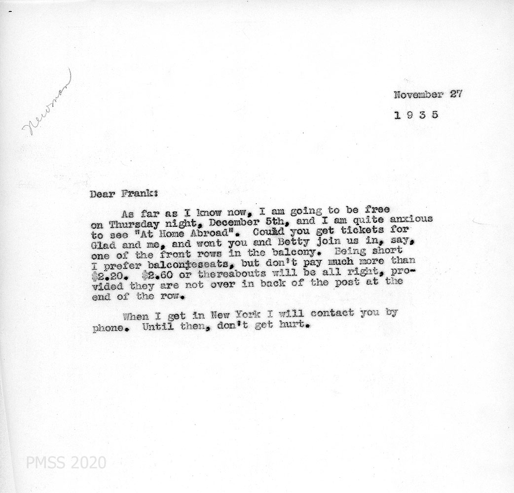 [019] November 27, 1935. To Frank from [unsigned, likely Morris], who asks for tickets for him and Gladys for “At Home Abroad”; asks that Frank and Betty join them. “Being short I prefer balcony seats….”