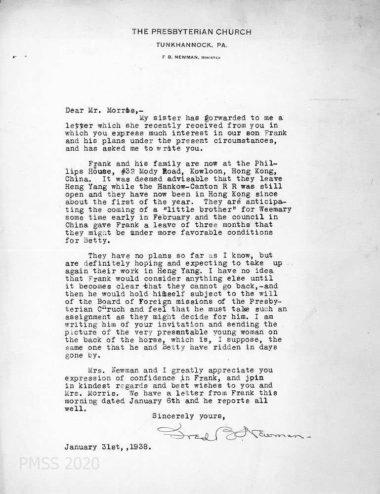 [020] January 31, 1938. To Mr. Morris from Fred B. Newman on letterhead for “The Presbyterian Church, Tunkhannock, PA, F.B. Newman, Minister,” who provides information about his son, Frank, at Morris’s request. “Frank and his family are now at the Phillips House…, Kowloon, Hong Kong, China. It was deemed advisable that they leave Heng Yang while the Hankow-Canton R R was still open and they have now been in Hong Kong since about the first of the year. They are anticipating the coming of a ‘little brother’ for Weemary (sic) some time early in February and the council in China gave Frank a leave of three months that they might be under more favorable conditions for Betty.” They hope to return to Heng Yang but it depends on the decision of the Board of Foreign Missions of the Presbyterian Church. Fred Newman writes that he will forward Morris’s invitation and photo of a woman on a horse and appreciates Morris’s confidence in Frank.