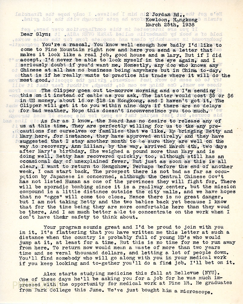 [022], [022a] March 25, 1938. Two-page letter to Morris from Newman in Kowloon, Hong Kong, [022] who declines Morris’s request to return to PMSS, writing “any doc who knows any Chinese at all has no business being anywhere but in China to-day…to practice his trade where it will do the most good.” He is sending this letter on the Clipper instead of cable which is cheaper. “Ann Lilian…arrived March 4th, two days after Mary’s birthday.” He hopes to return to Hengchow soon and describes the war situation in the area. After graduating from Park College this June, “Alex starts studying medicine this fall at Bellevue (NYU).” Alex is interested in medical work at PMSS. [022a] Suggests that Morris read Japan Over Asia, by Chamberlin. Suggests writing “prayer letters” as a way for ordinary people to deal with the many international crises.