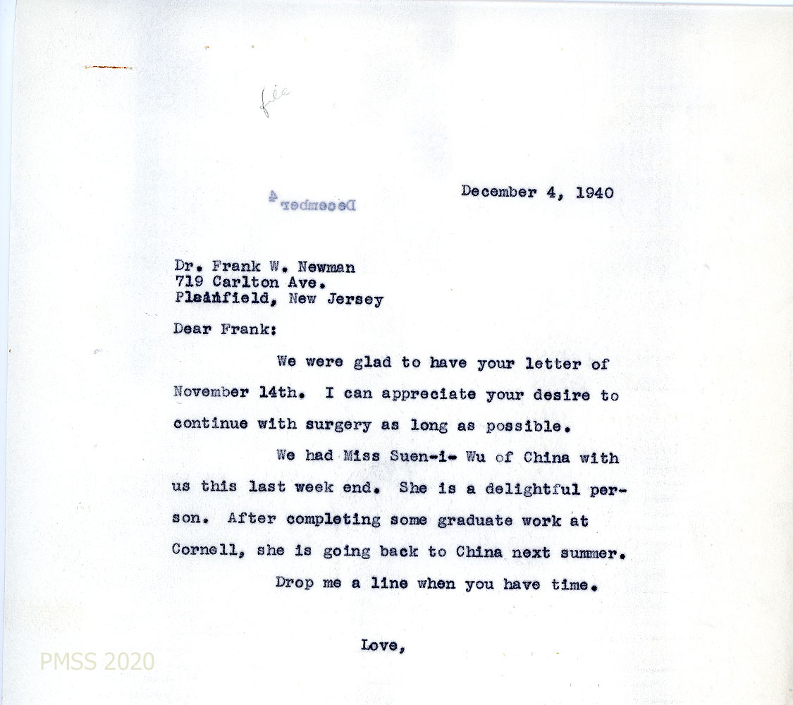 [026] December 4, 1940. To Frank from [unsigned, likely Morris]. “We had Miss Suen-i-Wu of China with us this last weekend. She is a delightful person. After completing some graduate work at Cornell, she is going back to China next summer.”