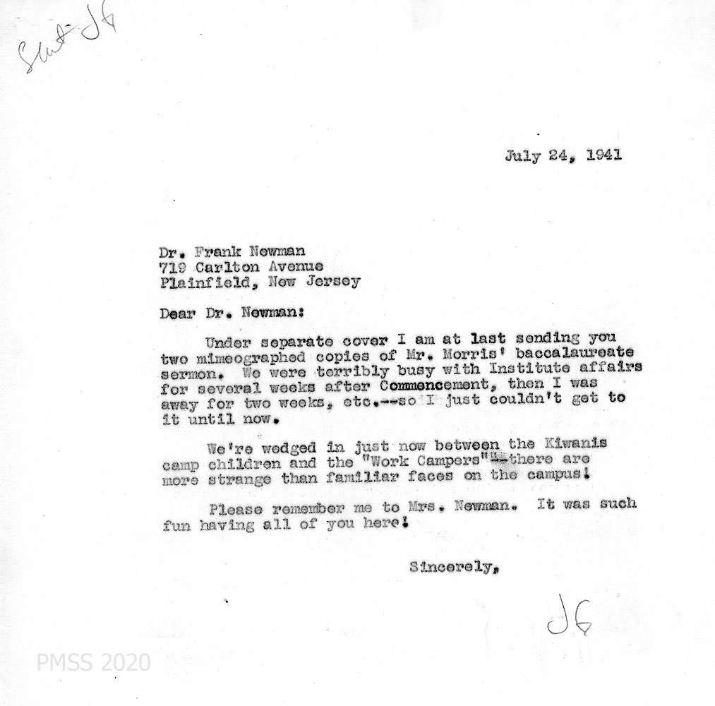 [039] July 24, 1941. To Dr. Newman from [unsigned, apparently, Miss Grant], who is sending two mimeographed copies of Mr. Morris’s baccalaureate sermon. Mentions that the School is hosting the Kiwanis camp children and the “Work Campers.”