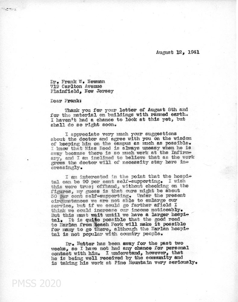 [042], [042a] August 12, 1941. Two-page letter to Frank from Morris. [042] Thanks him for the rammed earth buildings information; appreciates Newman’s suggestion about keeping the doctor on campus; and that the hospital can be 90% self-supporting. “I wish this were true; offhand,…my guess is that ours might be about 30% self-supporting,” because, currently, the School cannot enlarge its service. Morris hears that Dr. Nutter is “well-received by the community and is taking his work at Pine Mountain very seriously. [042a] He has had some theological background, I believe, and is very much interested in man’s spirit, as well as his body.”
