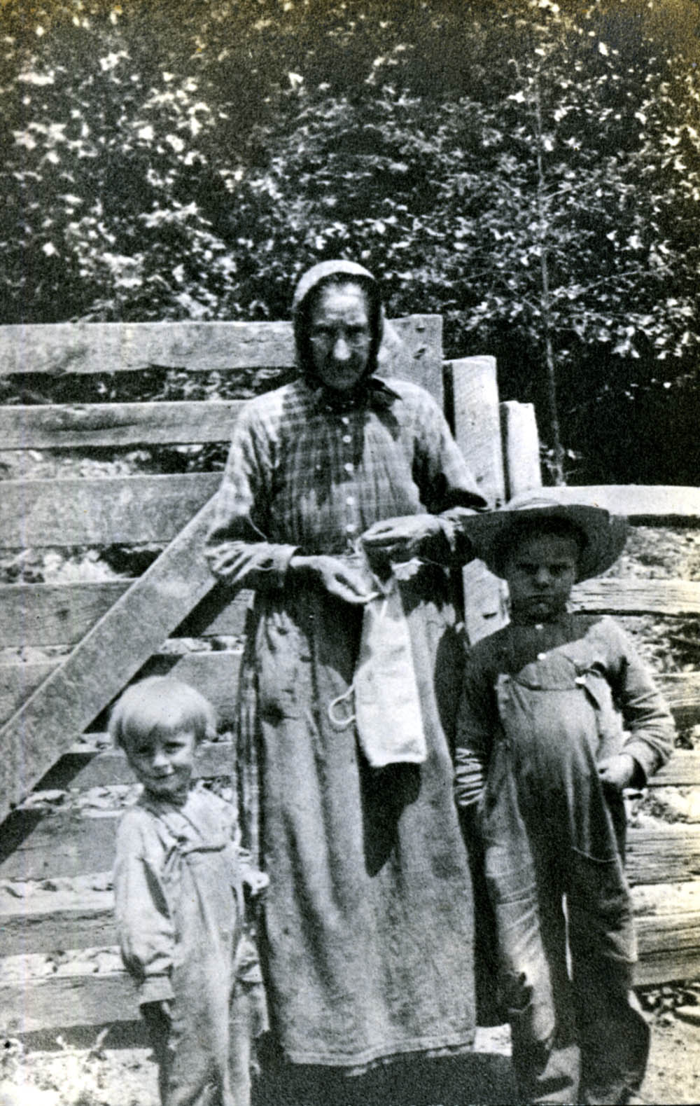 - Aunt Bet Scott seated in front of cabin with two young boys to her right. Vl_37_1185c.jpg