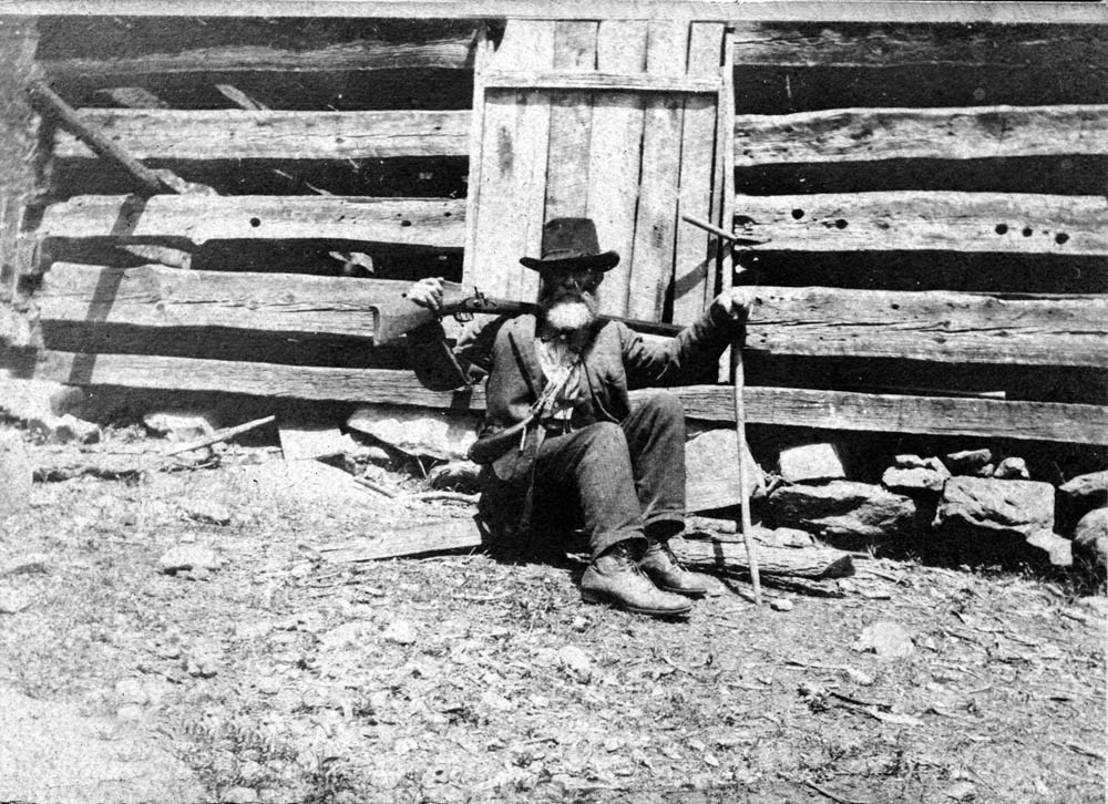 - Uncle William Creech seated in front of log [barn ?] Vl_37_1196.jpg