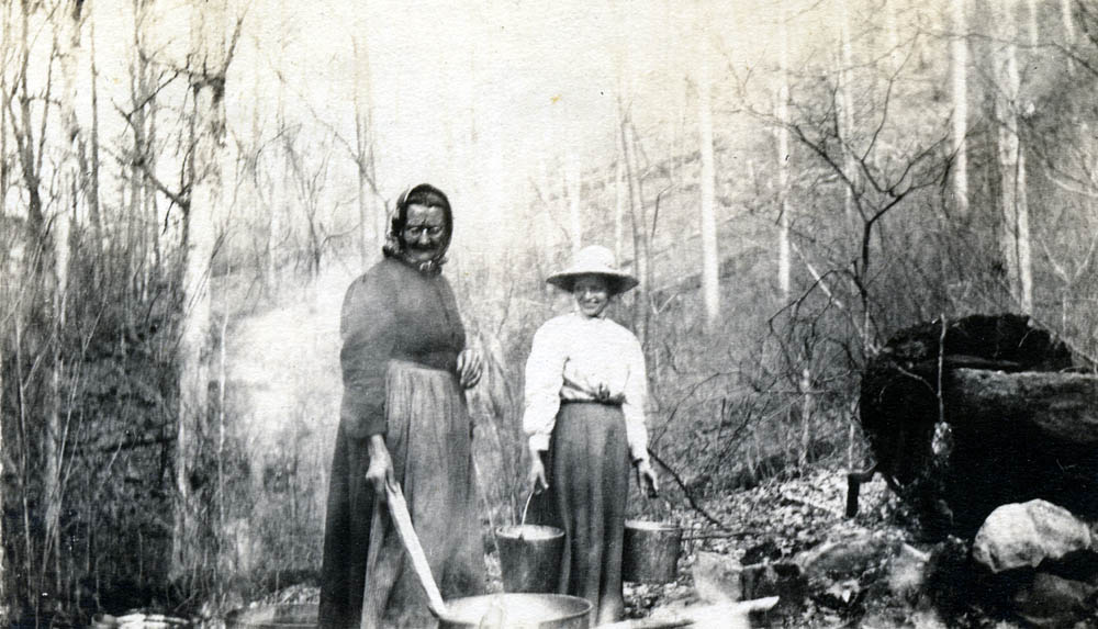 - Aunt Sal and Ethel de Long [?] boiling down maple syrup. [Vl_37_1202.jpg]