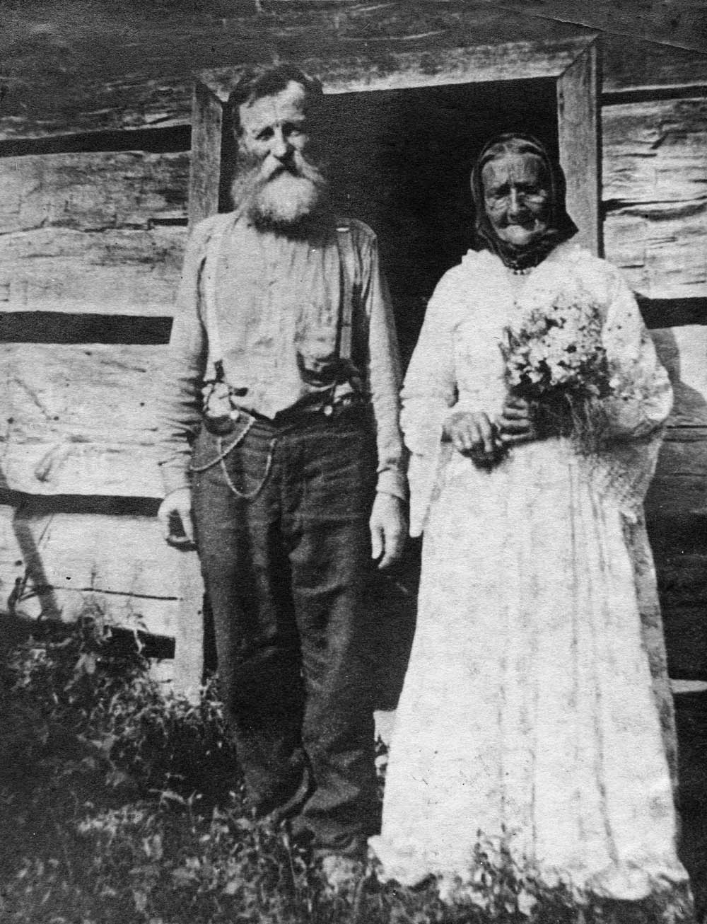- Uncle William and Aunt Sally Creech in front of their first cabin home. Re-enacting their wedding. Vl_37_1199a.jpg