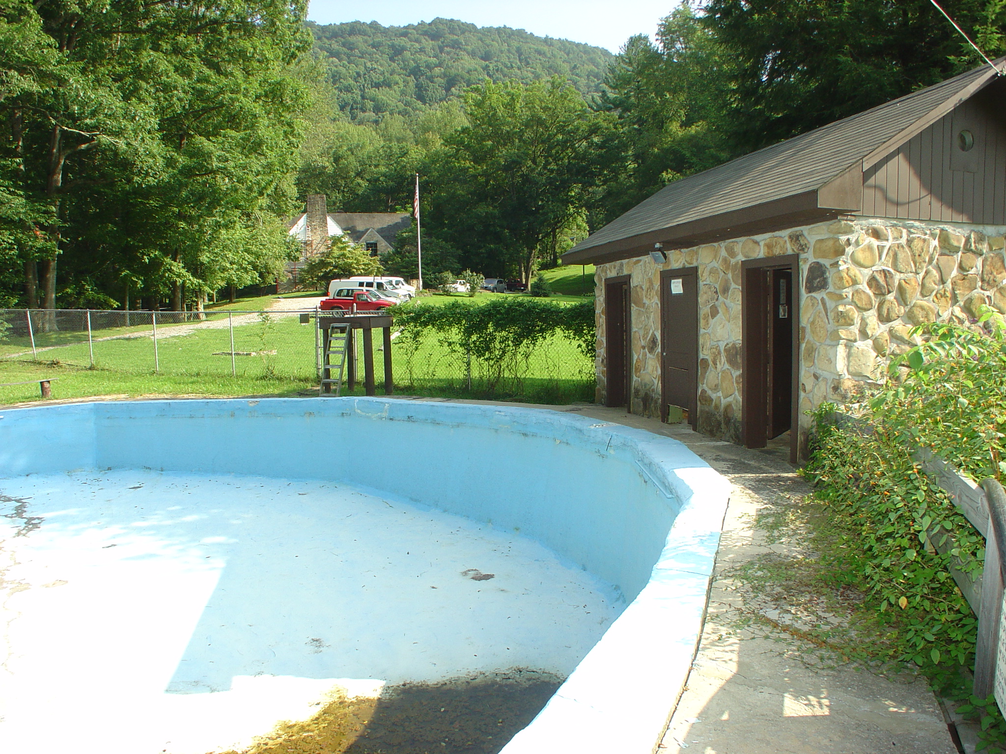 Swimming Pool ; Bath House ; Change House ; Pine Mountain Settlement School ; remodeling ; State Department of Health ; filtration systems ; concrete surrounds ; Limestone Creek water ; reservoir ; local stone ; aqua paint ; wading pools ; community ; recreation ; money contributions ; local creeks ; learning to swim ; rituals ; celebration ; dunkings ; gold medals ; Senior Olympics ; students ; Lela Christian ; diving skills ; state regulations ; insurance costs ; Environmental Education ; community pavilion ; diving boards ; Pine Mountain, KY ; Harlan County, KY ; |