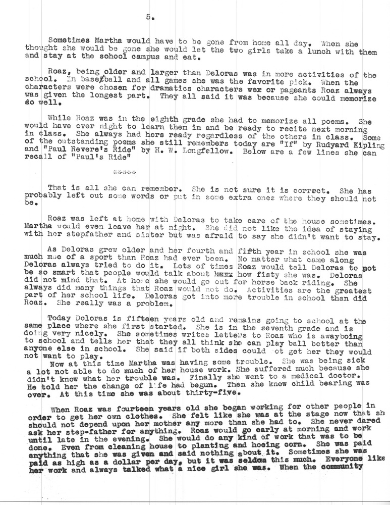 As Deloras grew older and her fourth and fifth year in school she was much more of a sport than Roaz had ever been. No matter what came along Deloras always tried to do it. Lots of times Roaz would tell Deloras to not be so smart that people would talk about how “fisty” she was. Deloras did not mind that. At home she would go out for horse back riding. She always did many things that Roaz would not do. Activities were the greatest part of her school life. Deloras got into more trouble in school than did Roaz. She really was a problem.