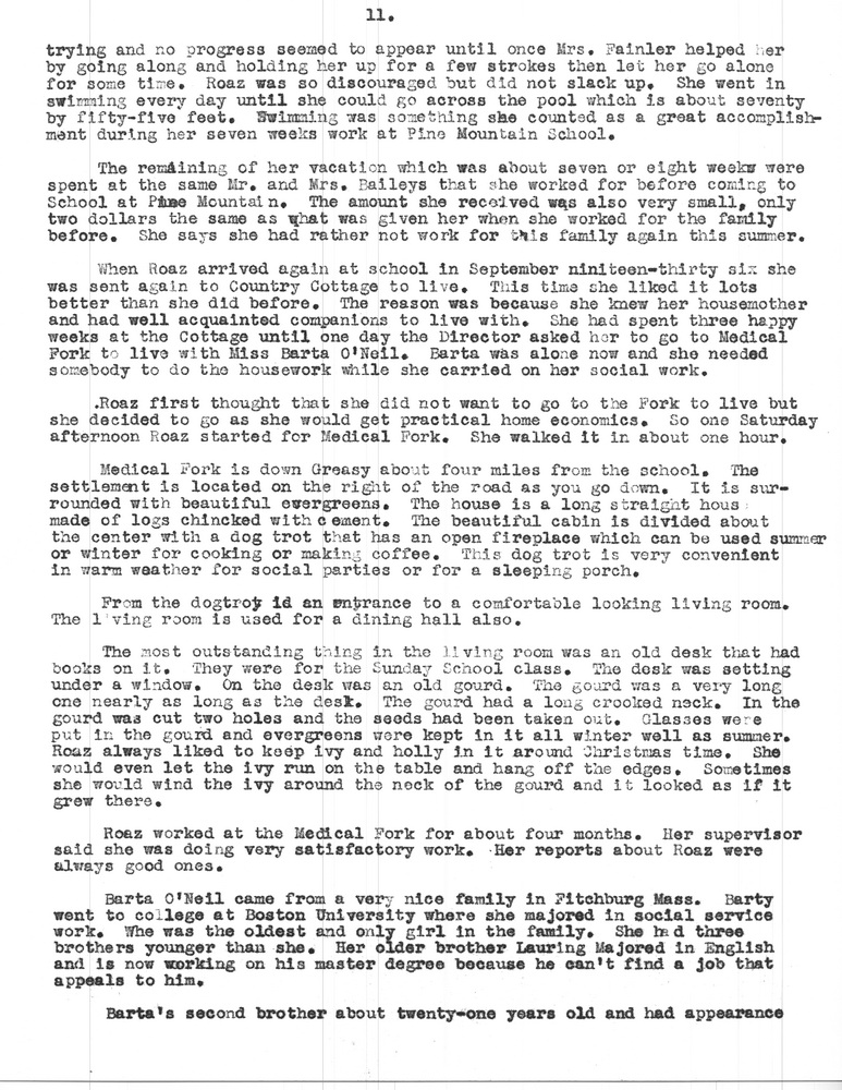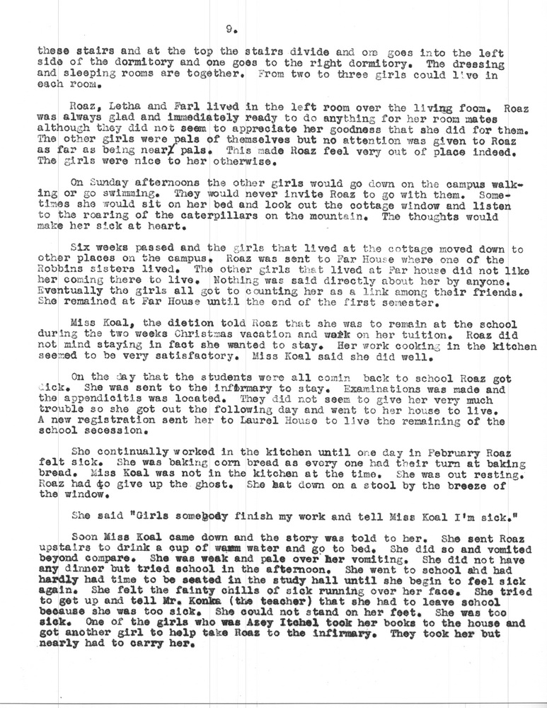 Two Robbins girls from Roaz’s neighborhood had gone to school at Pine Mountain Settlement School. They had told Roaz about it and she was becoming interesting (sic) in trying to get a place to go to Pine Mountain. She soon wrote to the Director, telling about the financial part and her wanting to come to Pine Mountain to try school for a while. She realized she was getting only two dollars a week for her work and she wondered how she could go to school and buy clothes in order to get started when school opened the first of September. She had only one month left now to do what she was going to [do].