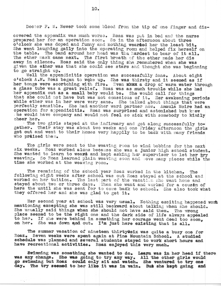…trying and no progress seemed to appear until once Mrs. Fainler helped her by going along and holding her up for a few strokes then let her go alone for some time. Roaz was so discouraged but did not slack up. She went in swimming every day until she could go across the pool which is about seventy by fifty-five feet. Swimming was something she counted as a great accomplishment during her even weeks work at Pine Mountain School.