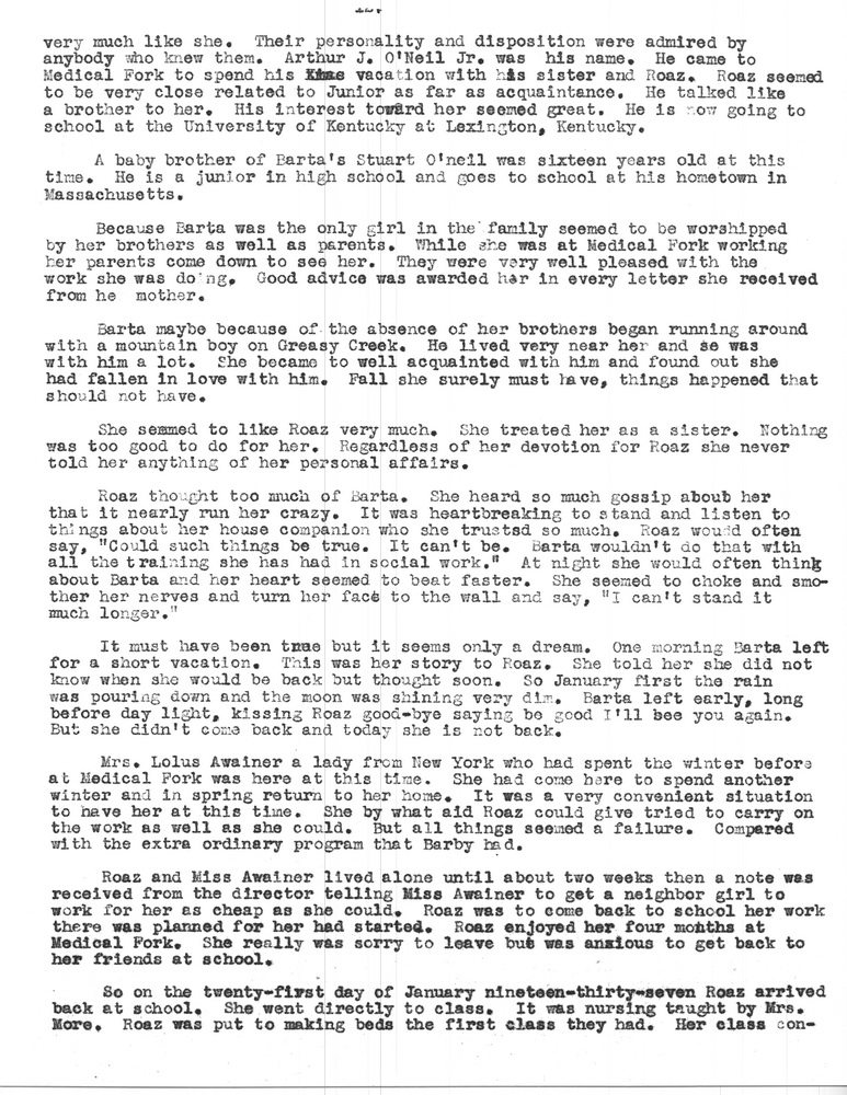 …very much like she. Their personality and disposition were admired by anybody who knew them. Arthur J. O’Neil Jr. was his name. He came to Medical Fork to spend his vacation with his sister and Roaz. Roaz seemed to be very close related to Junior as far as acquaintance. He talked like a brother to her. His interest toward her seemed great. He is now going to school at the University of Kentucky at Lexington, Kentucky.
