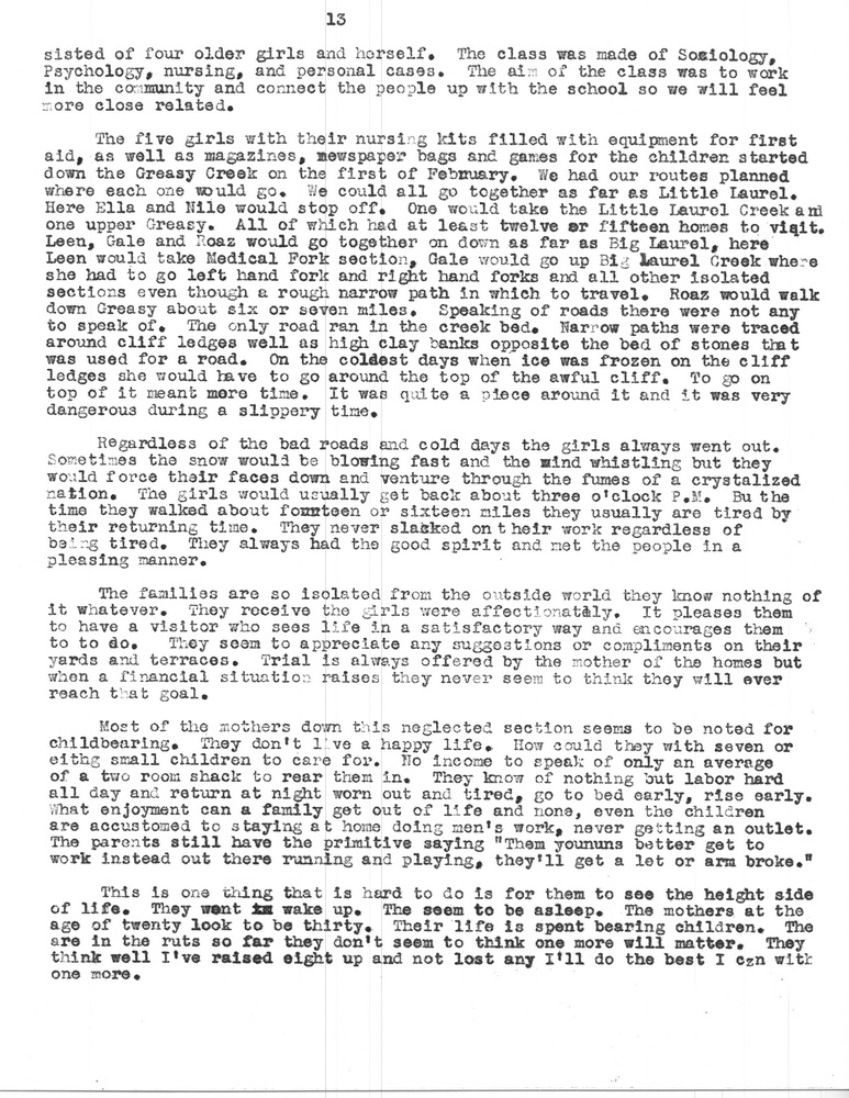 The five girls with their nursing kits filled with equipment for first aid, as well as magazines, newspaper bags and games for the children started down Greasy Creek on the first of February. We had our routes planned where each one would go. We could all go together as far as Little Laurel. Here Ella and Nile would stop off. One would take the Little Laurel Creek and one upper Greasy. All of which had at least twelve or fifteen homes to visit. Leen, Gale and Roaz would go together on down as far as Big Laurel; here Leen would take Medical Fork section, Gale would go up Big Laurel Creek where she had to go left hand fork and right hand fork and all other isolated sections even though a rough narrow path in which to travel. Roaz would walk down Greasy about six or seven miles. Speaking of roads, there were not any to speak of. The only road ran in the creek bed. Narrow paths were traced around cliff ledges well as high clay banks opposite the bed of stones that was used for a road. On the coldest days, when ice was frozen on the cliff ledges, she would have to go around the top of the awful cliff. To go on top of it meant more time. It was quite a piece around it and it was very dangerous during a slippery time.