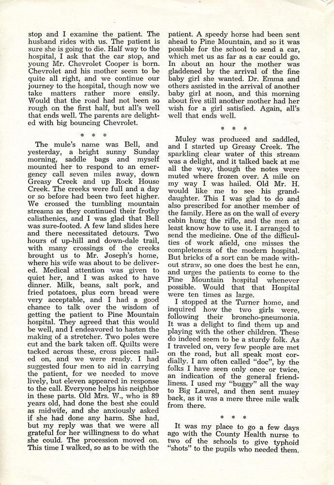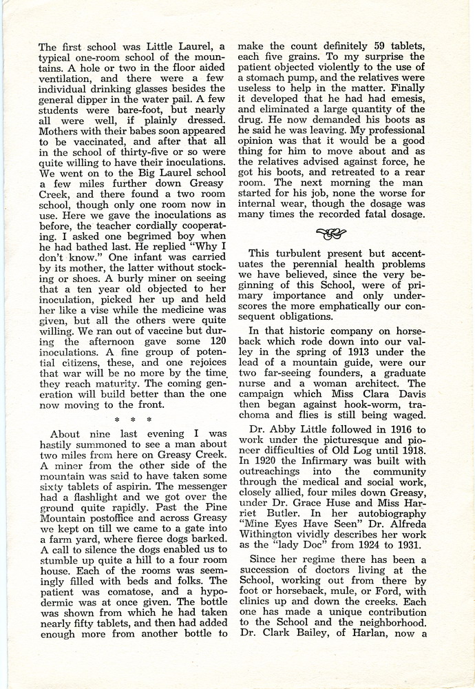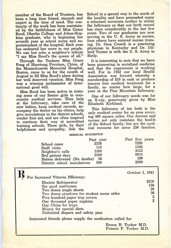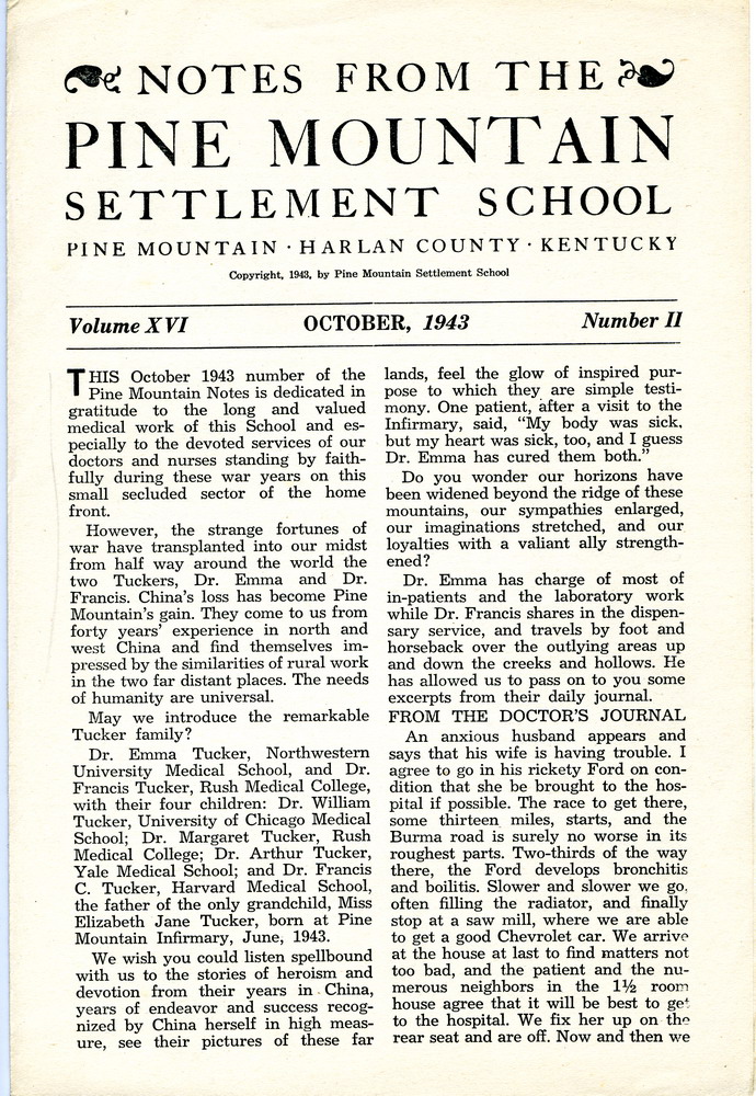 NOTES – 1943 OCTOBER: doctors ; Greasy Creek ; Rock House Creek ; medicine ; Dr. Emma Tucker ; Dr. Francis Tucker ; Dr. Margaret Tucker ; Glyn A. Morris ; Dr. Arthur Tucker ; Elizabeth Jane Tucker ; Grace Feng ; Grace Rood ; Dr. Oma Creech ; Elizabeth Kirkland ; medical service ; Clara Davis ; Dr. Abby Little ; Infirmary ; Dr. Grace Huse ; Harriet Butler ; Dr. Alfreda Withington ; Dr. Clark Bailey ; Dr. Dillard Turner ; socialized medicine ; Health Association ;