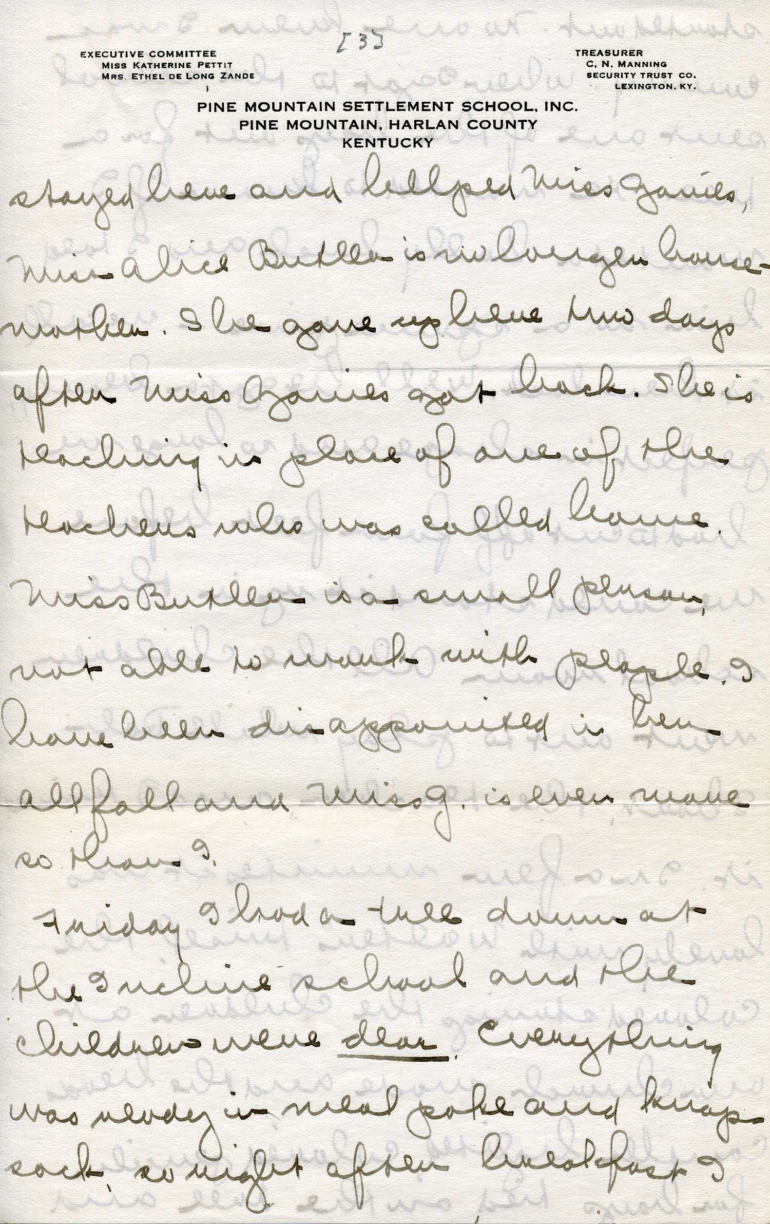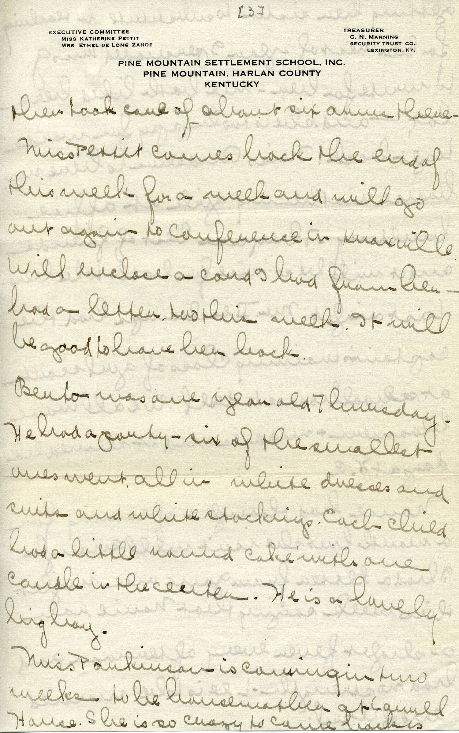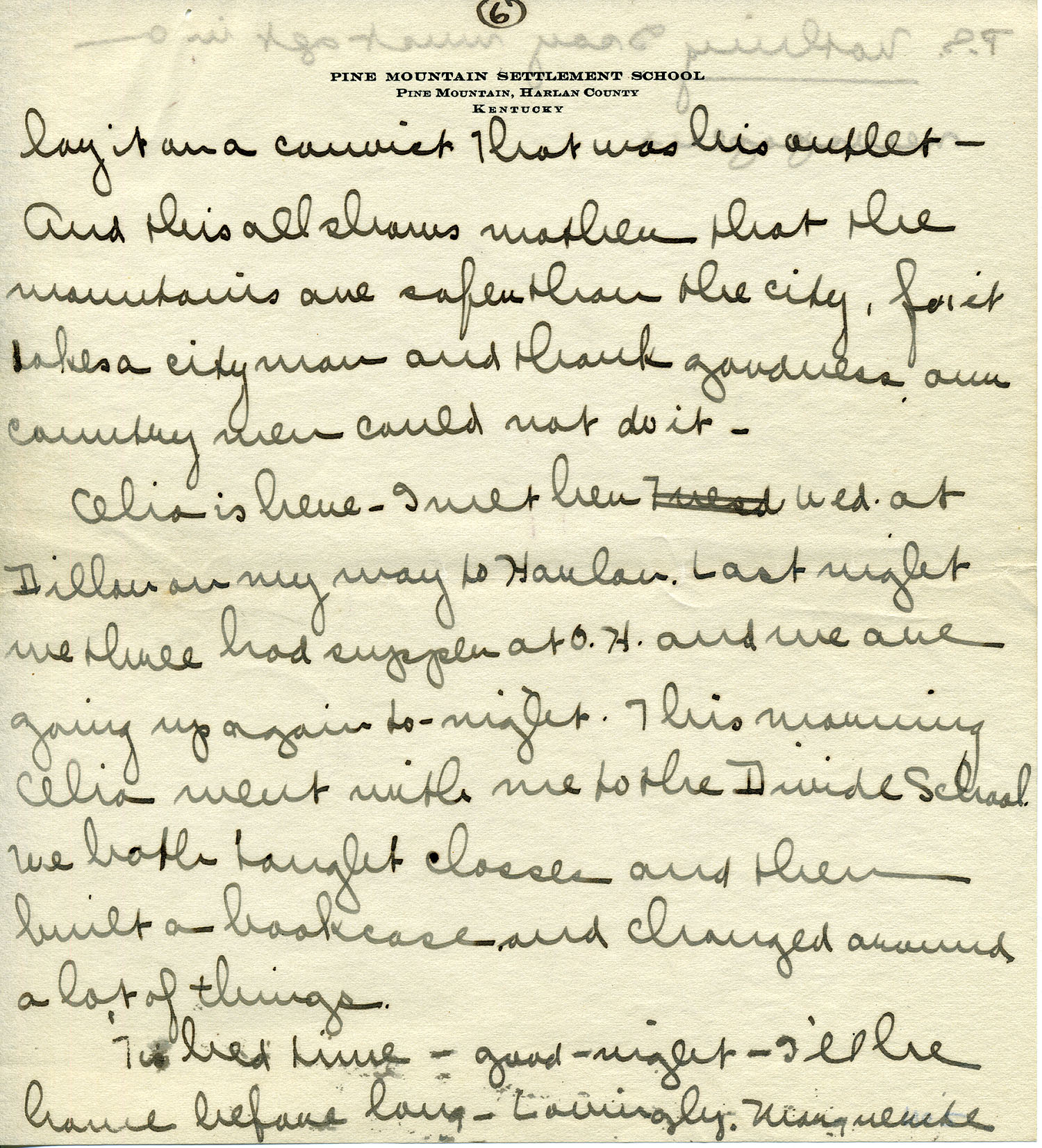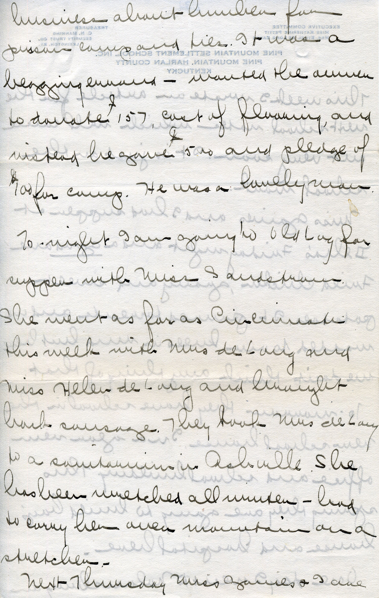 Tuesday I am going to Harlan for two or three days. Have many things to do, the chief one being to speak before fiscal court to get money for road from here to Big Laurel. You never can tell when you can get before court. Miss Sandstrom is going with me to see about some public health work. I was going to ride clear there but Miss Sandstrom [Esther Sandstrom, nurse] has ridden so little it would take too long going with her, so now I am going by train.