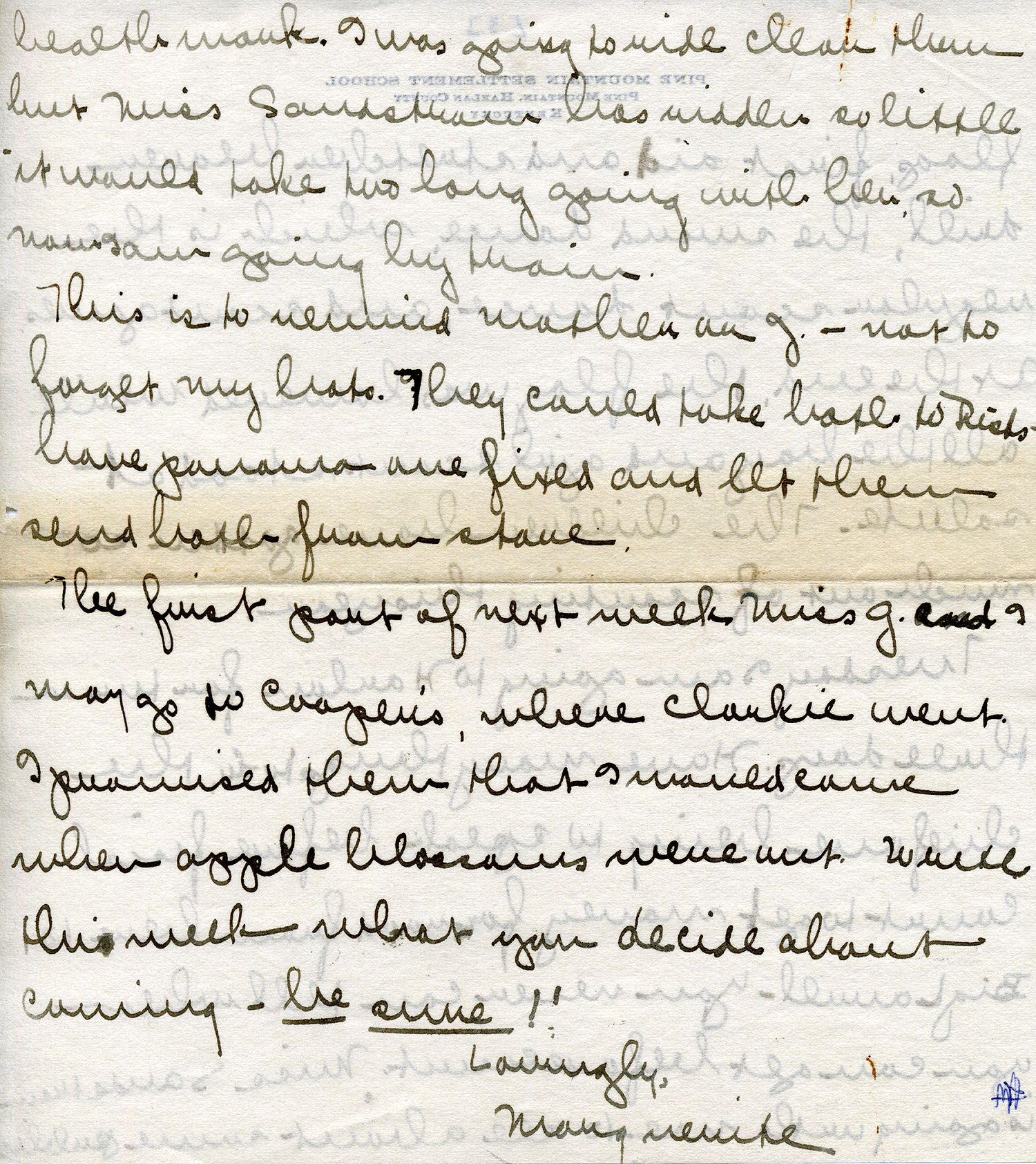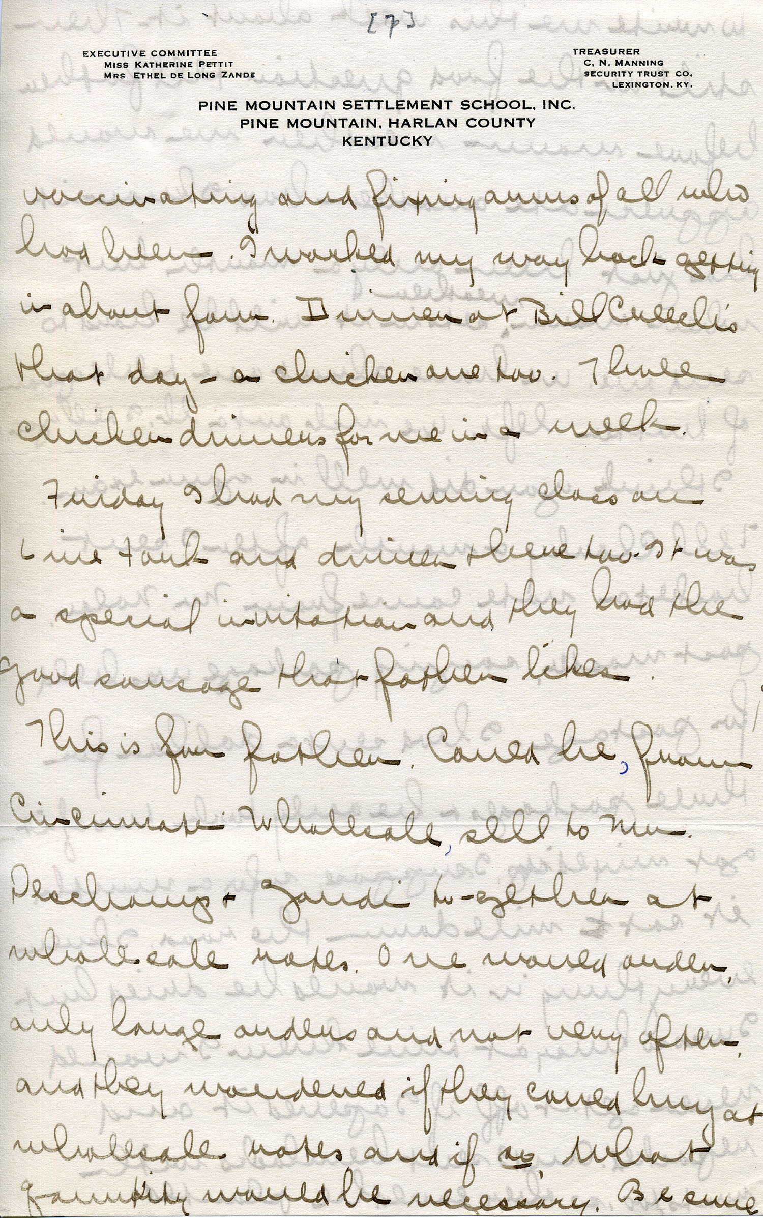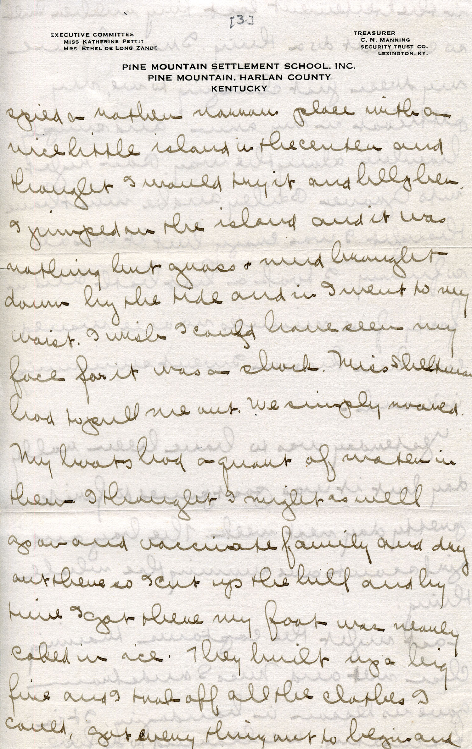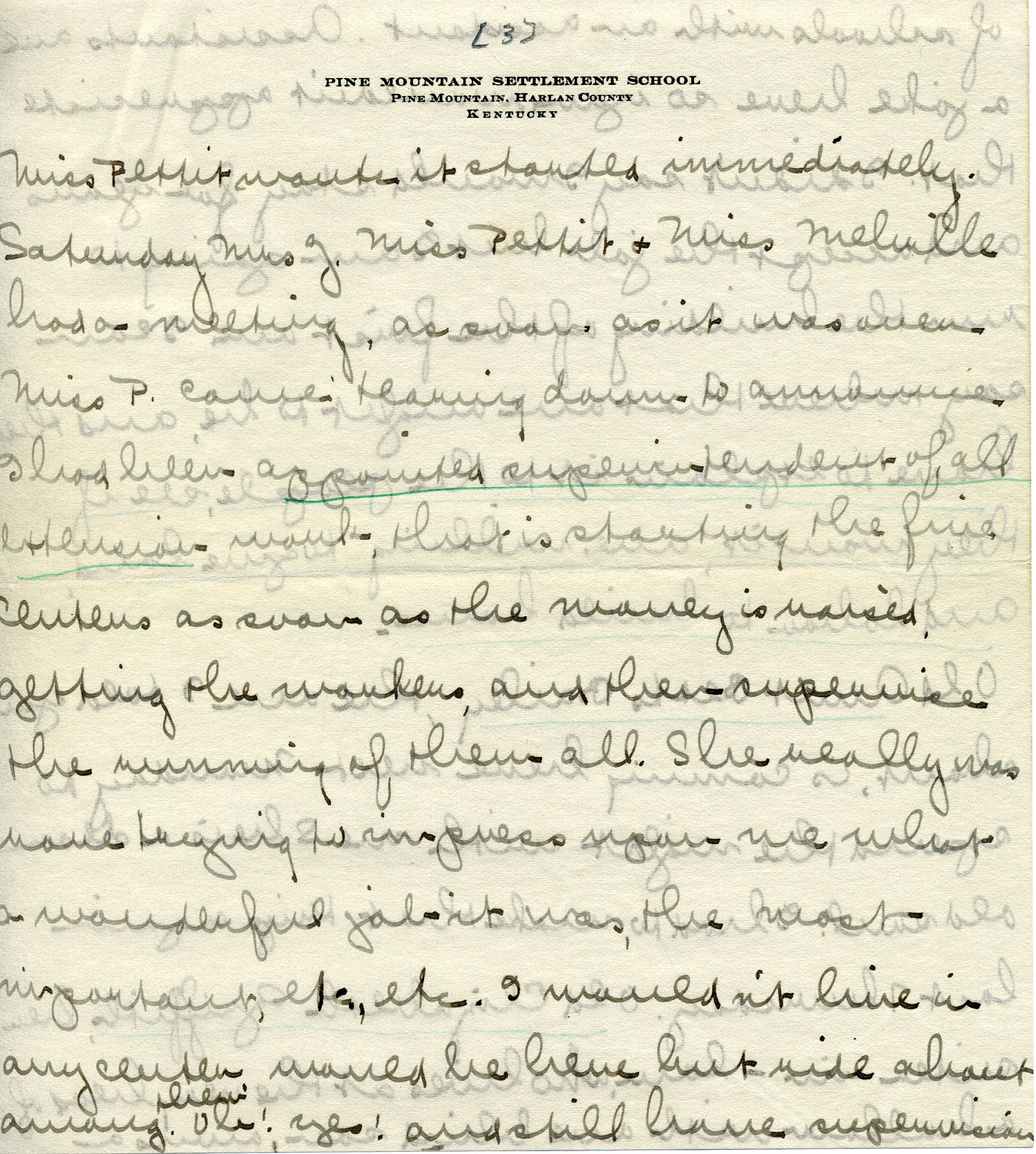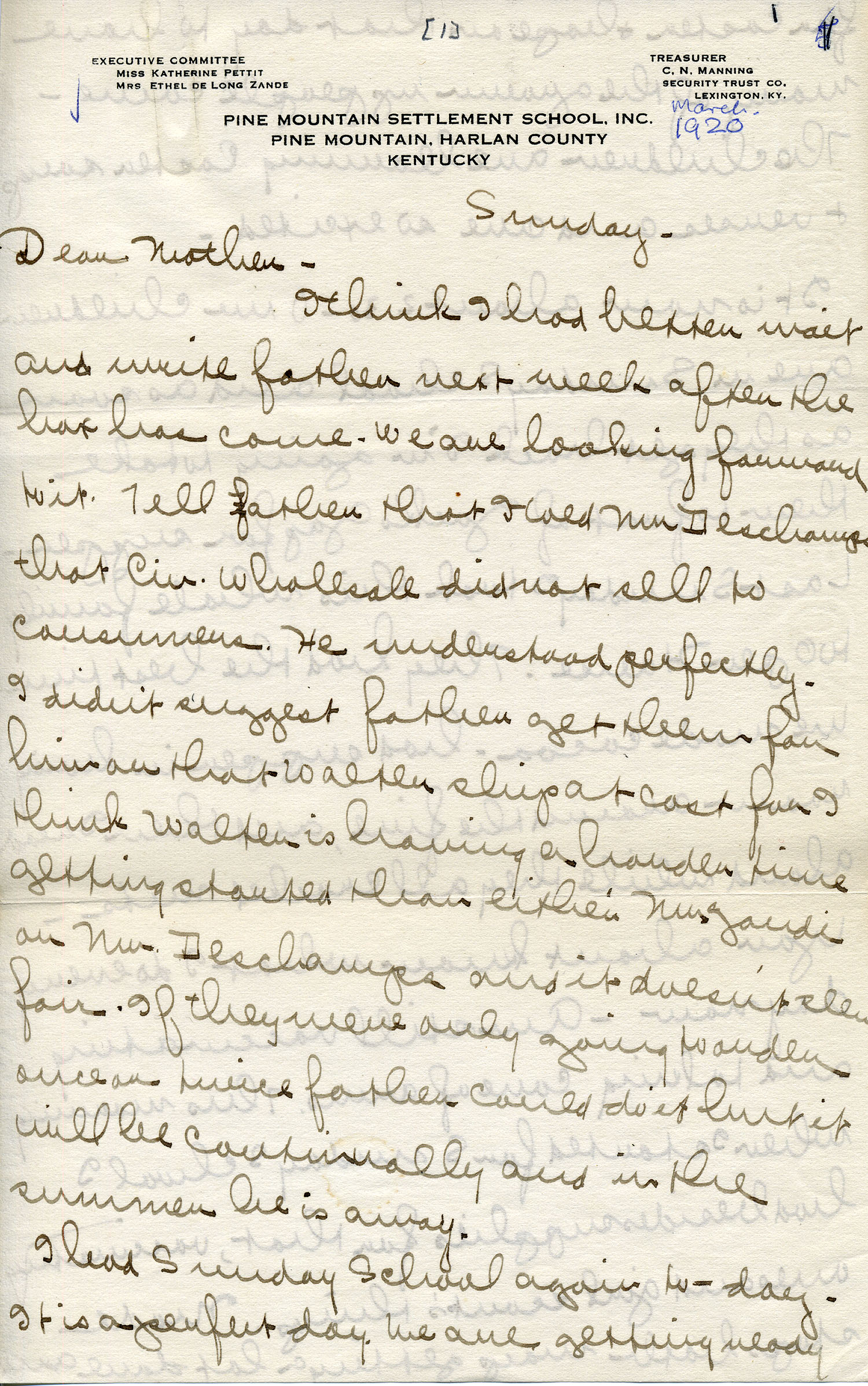 Tuesday I am going to Harlan for two or three days. Have many things to do, the chief one being to speak before fiscal court to get money for road from here to Big Laurel. You never can tell when you can get before court. Miss Sandstrom is going with me to see about some public health work. I was going to ride clear there but Miss Sandstrom [Esther Sandstrom, nurse] has ridden so little it would take too long going with her, so now I am going by train.