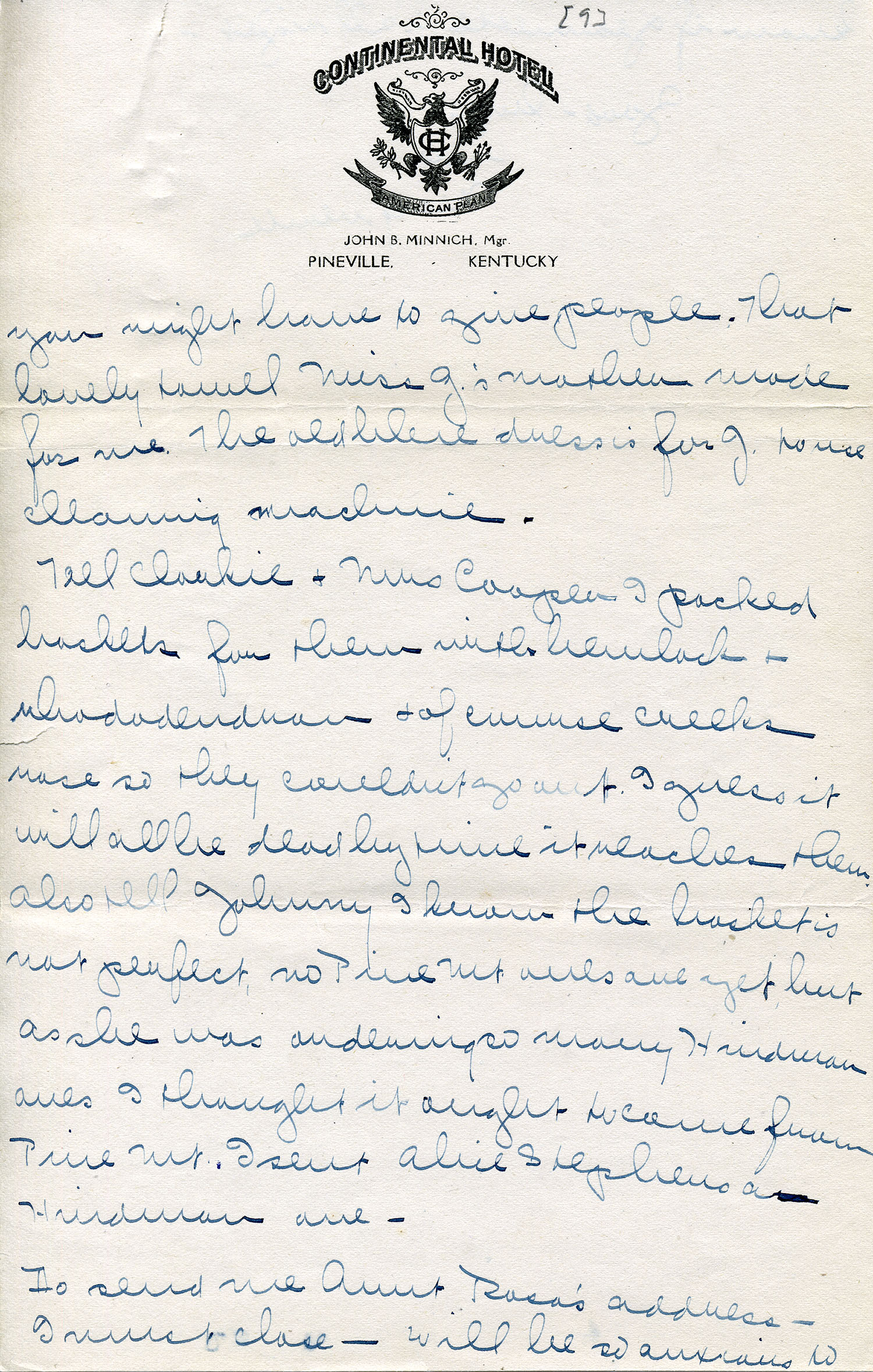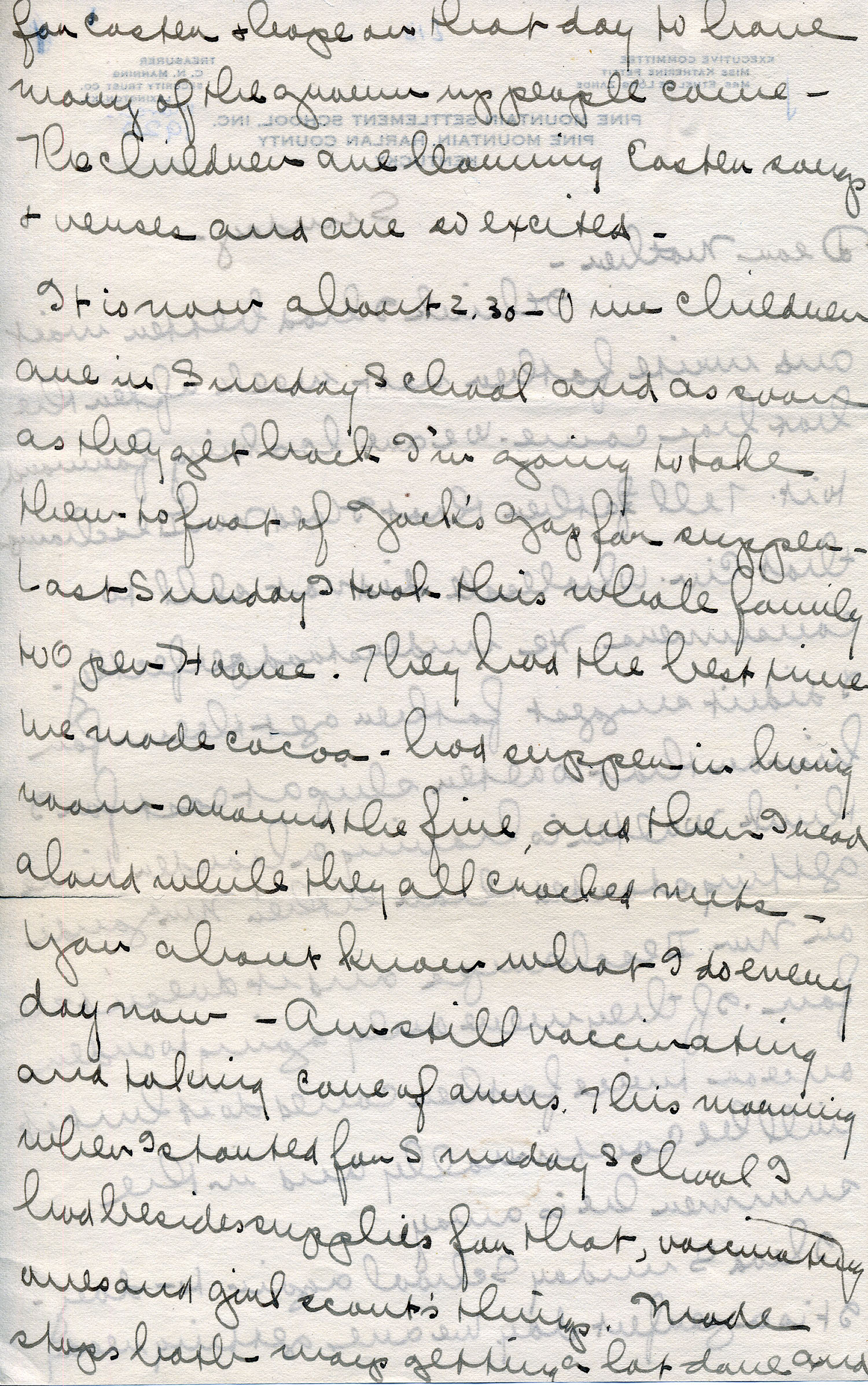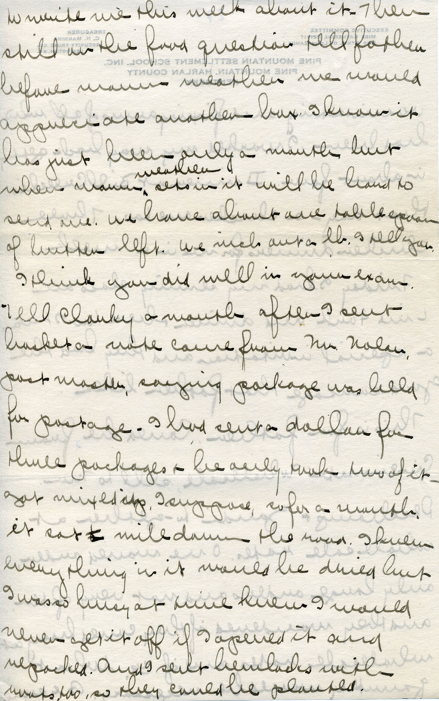 Ask Clarkie to tell you about our tree at Cooper’s – the one on Straight Creek. I am sending home a suitcase; meal poke is yours. The skirt Miss Mollay is going to fix but leave it until she comes back for I am in no hurry. Be sure to put the envelope I marked in my desk and the rest of literature I thought you might have to give people. That lovely towel Miss G[aines]’ mother made for me. The old blue dress is for J. to use cleaning machine.