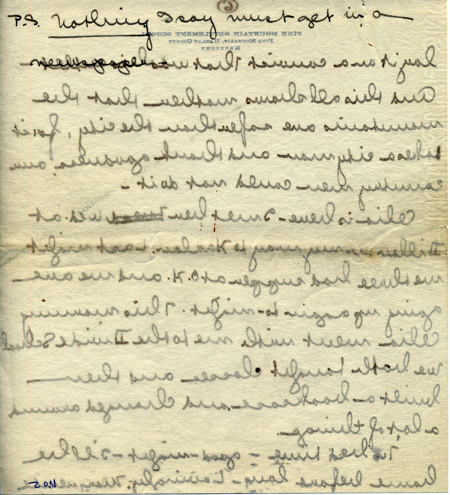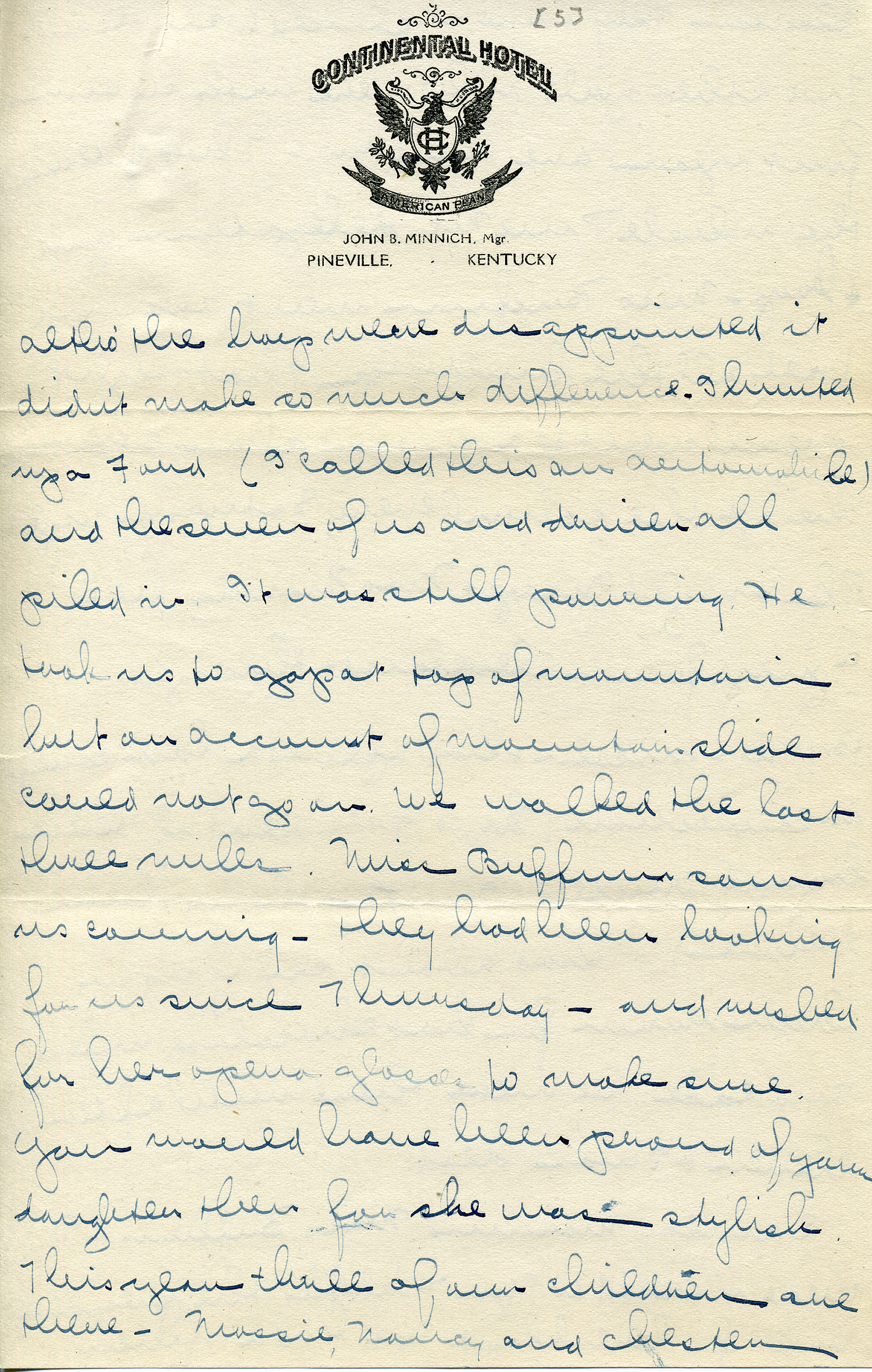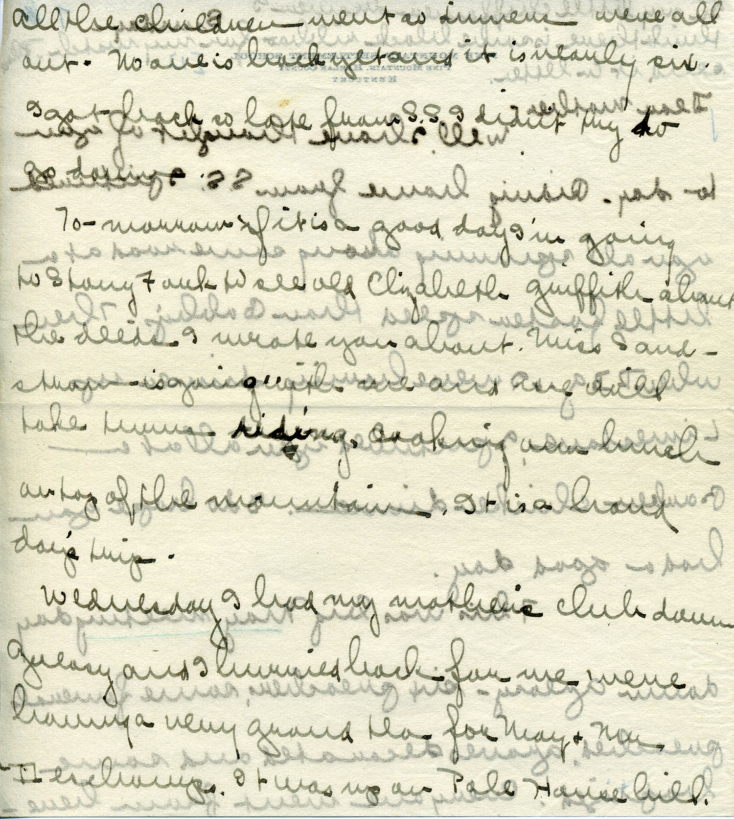 Ask Clarkie to tell you about our tree at Cooper’s – the one on Straight Creek. I am sending home a suitcase; meal poke is yours. The skirt Miss Mollay is going to fix but leave it until she comes back for I am in no hurry. Be sure to put the envelope I marked in my desk and the rest of literature I thought you might have to give people. That lovely towel Miss G[aines]’ mother made for me. The old blue dress is for J. to use cleaning machine.