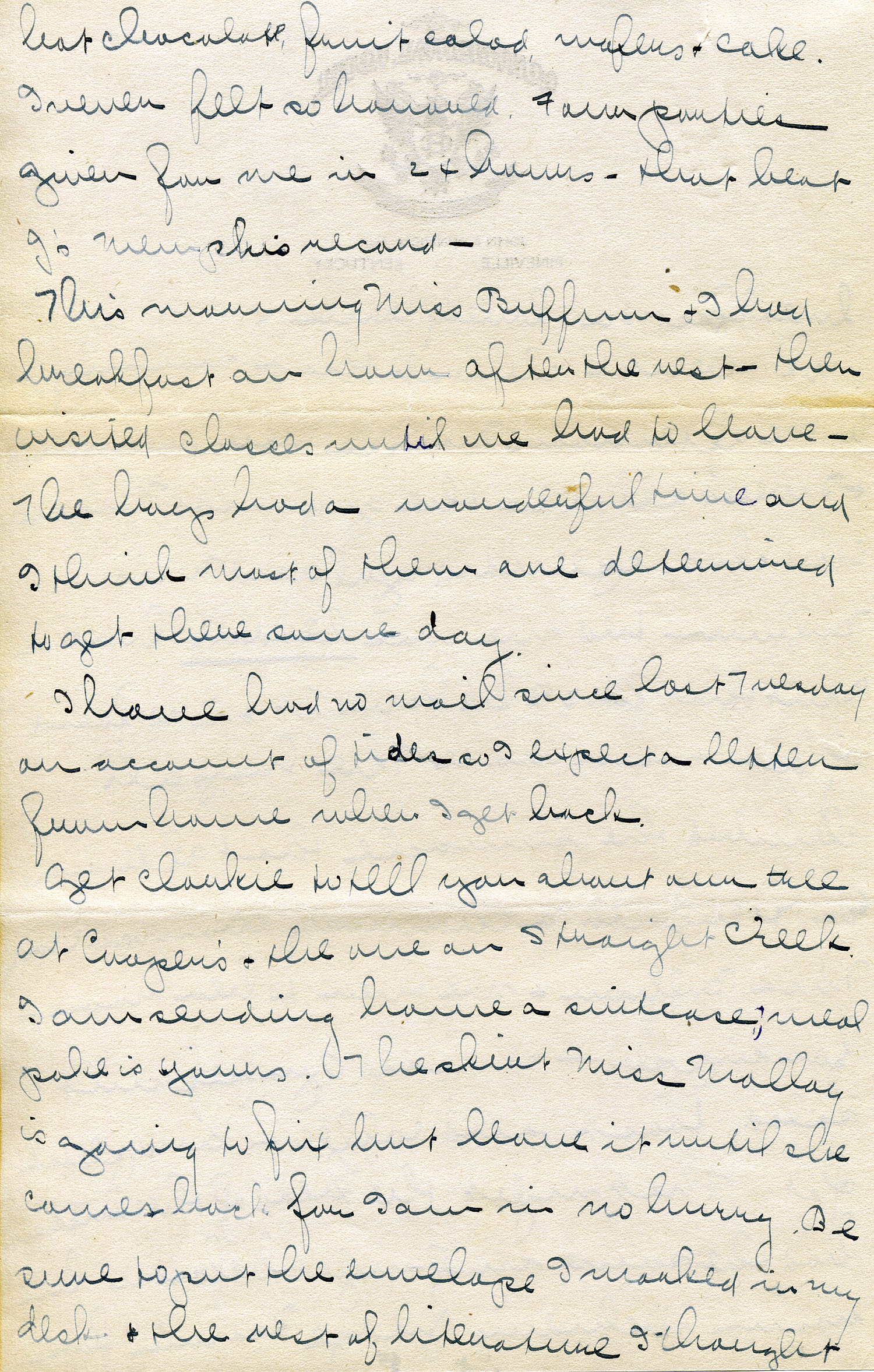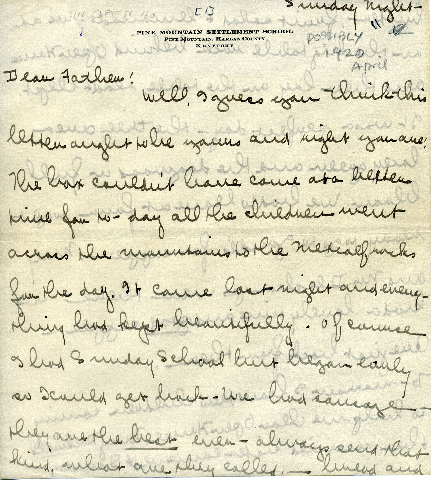 Dear Father, Well, I guess you think this letter ought to be yours and right you are! The box couldn’t have come at a better time for today all the children went across the mountains to the Metcalf rocks for the day. It came last night and everything had kept beautifully. Of course I had Sunday School but began early so I could get back. We had sausage – they are the best ever — always send that kind, what are they called? — bread and butter, fruit salad and lemonade. We ate on the big table rock behind Open House and then lay on the table, read and slept. It was a perfect day — the trees are a lacey green and the dogwood in full bloom. We had to leave at four to get ready to go to Zande’s for supper. May [May Ritchie] and Mr. Deschamps [Leon Deschamps] were there. We had a lovely time and good supper. Are just back from there.