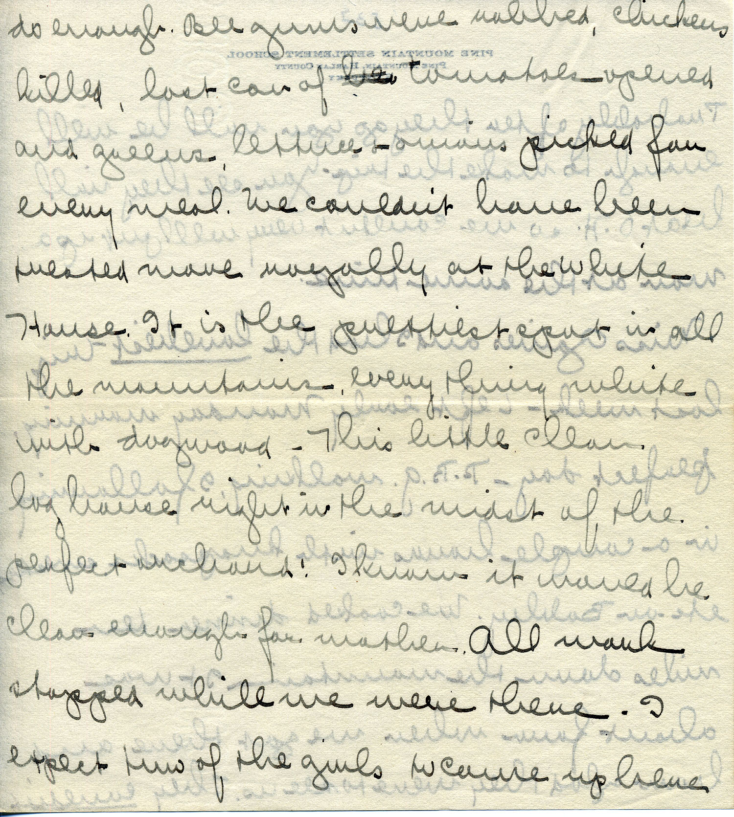 Miss Gaines and I had the loveliest trip last week. Left early Monday morning – perfect day – R.B.G. [Ruth B. Gaines] walking, I following in a couple of hours with knapsacks, sweaters, etc. on Bobby. We cooked dinner ten miles down the mountain. It was about four when we got there and how glad they were to see us. They couldn’t do enough. Bee gums were robbed, chickens killed, last can of tomatoes opened, and greens, lettuce – onions picked for every meal. We couldn’t have been treated more royally at the White House. It is the prettiest spot in all the mountains, everything white with dogwood. This little clean, log house right in the midst of the perfect orchard! I know it would be clean enough for Mother! All work stopped while we were there. I expect two of the girls to come up here over next Sunday.