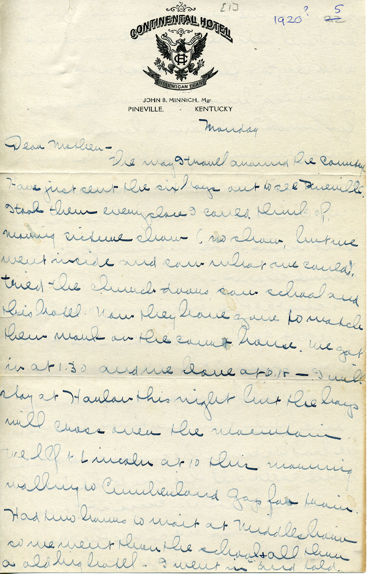 We got in at 1:30 and we leave at 6:18. I will stay at Harlan this night but the boys will cross over the mountain. We left Lincoln [University] at 10 this morning, walking to Cumberland Gap for train. Had two hours to wait at Middlesboro so we went through the school and all thru an old big hotel. I went in and told the proprietor the boys had never seen a big hotel and he took us everywhere to the very top floor. We sat at a counter, having egg, ham sandwiches, pie, etc., for lunch. Malcolm, a lovely boy, sat there grinning for all he was worth saying “I’m sure happy and hit only cost me 25