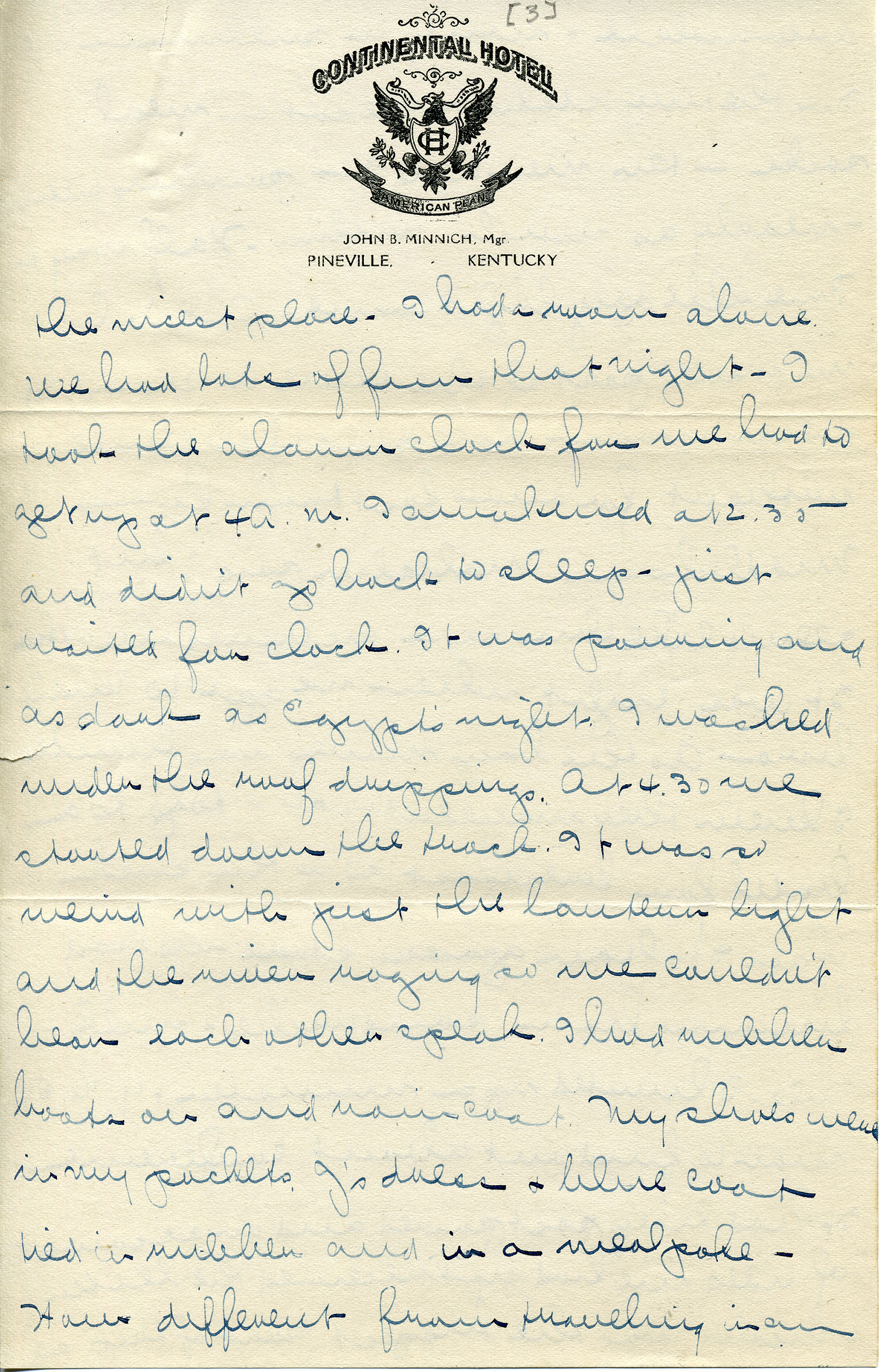 In the tiny station we sat on meal sacks — ten men and I — pouring outside and nearly as much within. Halfway to Pineville light came. At Oulu we waited part of the time in crowded dressing room and part of the time without, for our fast train for Middlesboro. Malcolm said “Hit seems like this one outruns the other.” It was eight when we got to Middlesboro. As the boys’ money was limited I knew they wouldn’t want to go to a hotel for breakfast so in the back of an Italian grocery store we had bananas, ham sandwiches and milk.