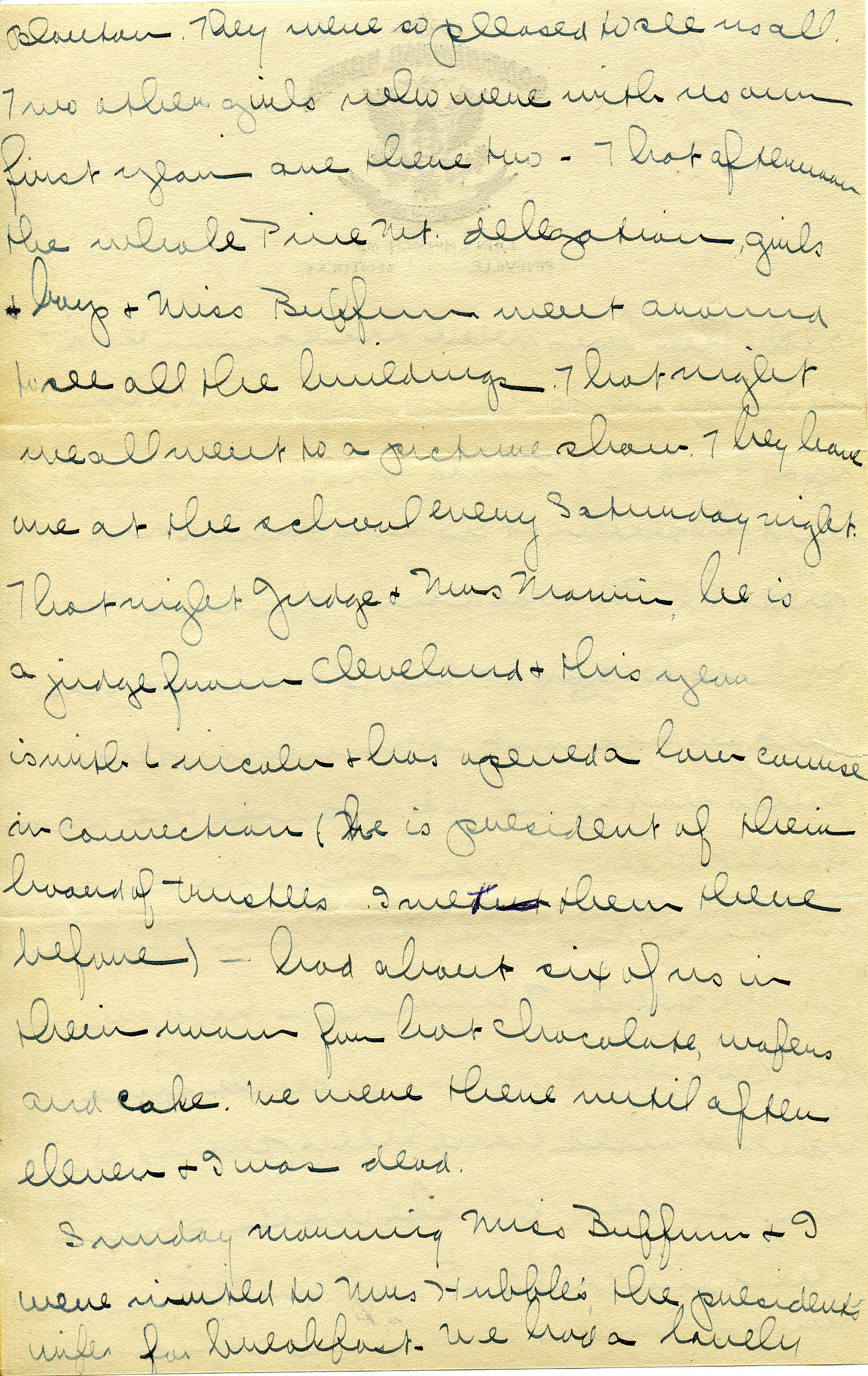 You would have been proud of your daughter then for she was stylish. This year three of our children are there – Mossie, Nancy and Chester Blanton. They were so pleased to see us all. Two other girls who were with us our first year are there too. That afternoon the whole Pine Mt. delegation, girls and boys and Miss Buffum, went around to see all the buildings. That night we all went to a picture show. They have one at the school every Saturday night. That night Judge and Mrs. Marvin (he is a judge from Cleveland and this year is with Lincoln and has opened a law course in correction (he is president of their board of trustees. I met them there before) had about six of us in their room for hot chocolate, wafers and cake. We were there until after eleven and I was dead.