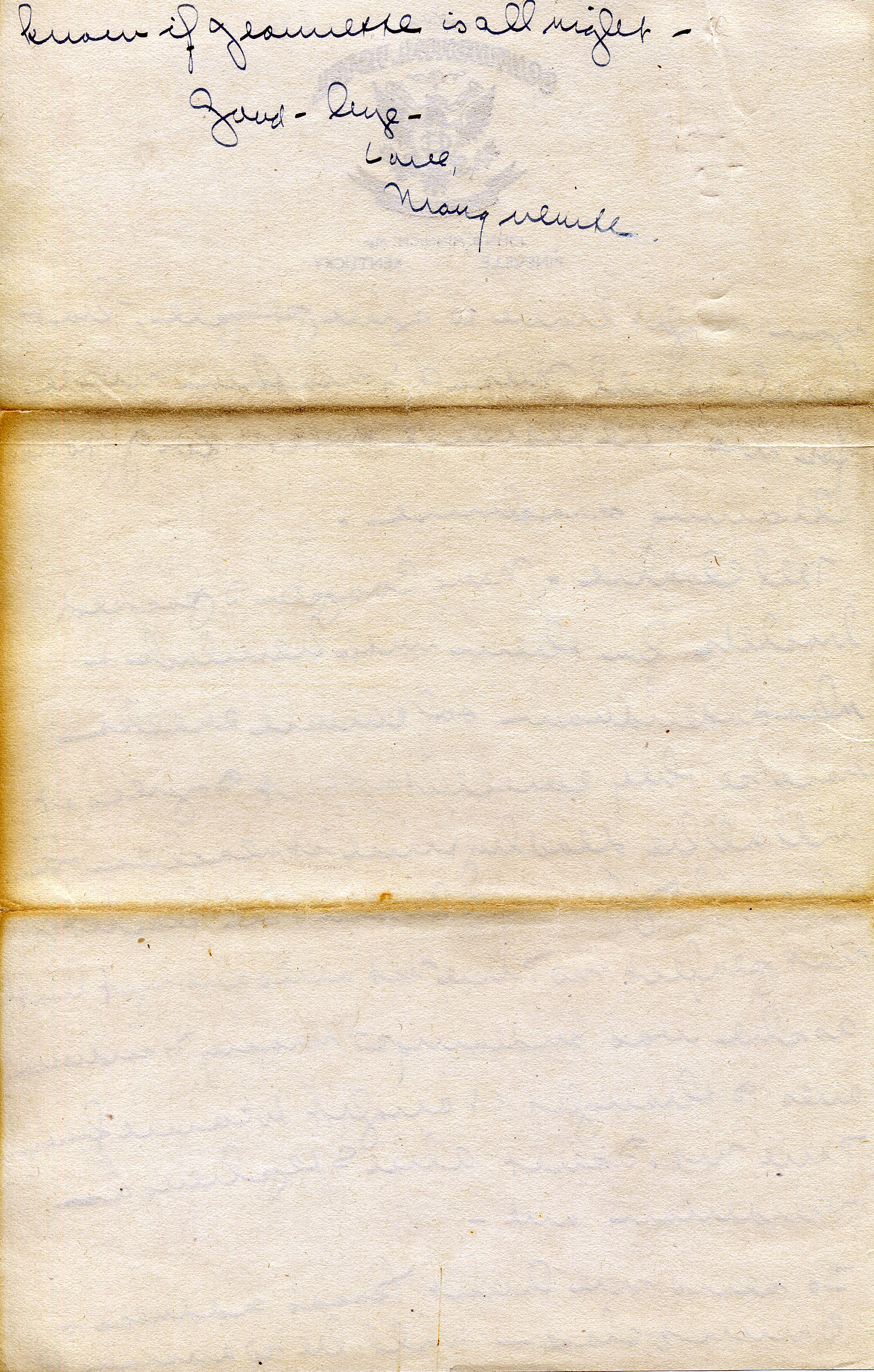 Dear Mother –I was glad to have yours and Jeannette’s letters. I am sure she will be better if she has her tonsils and adenoids out. I always thought she had them for she sleeps with her mouth open. Only hope she was well enough to enjoy part of her visit.
