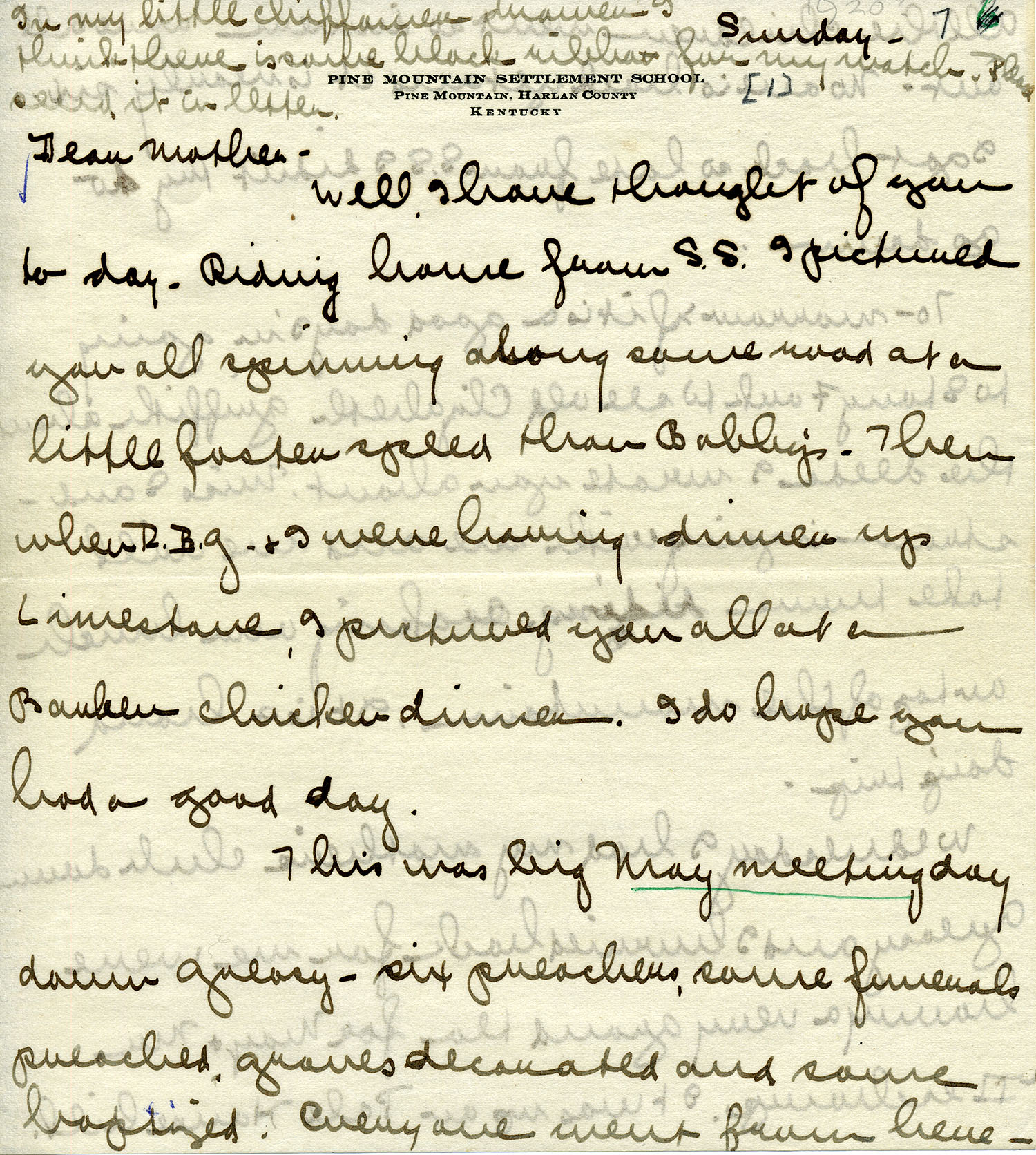 Dear Mother — Well, I have thought of you today. Riding home from S. S. I pictured you all spinning along some road at a little faster speed than Bobby’s. Then when R.B.G[aines]. and I were having dinner up Limestone, I pictured you all at a Banker chicken dinner. I do hope you had a good day.