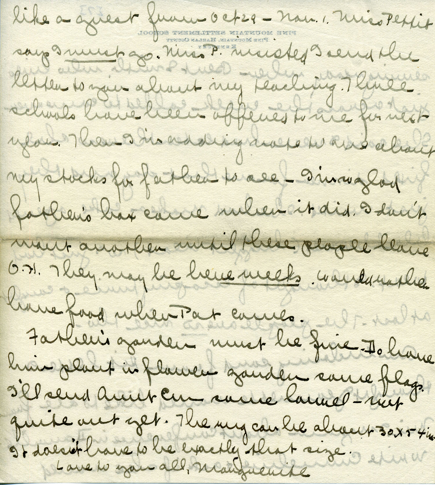 Father’s garden must be fine. Do have him plant in flower garden some flags. I’ll send Aunt Em some laurel – not quite out yet. The rug can be about 30 x 54 in. It doesn’t have to be exactly that size. Love to you all. Marguerite