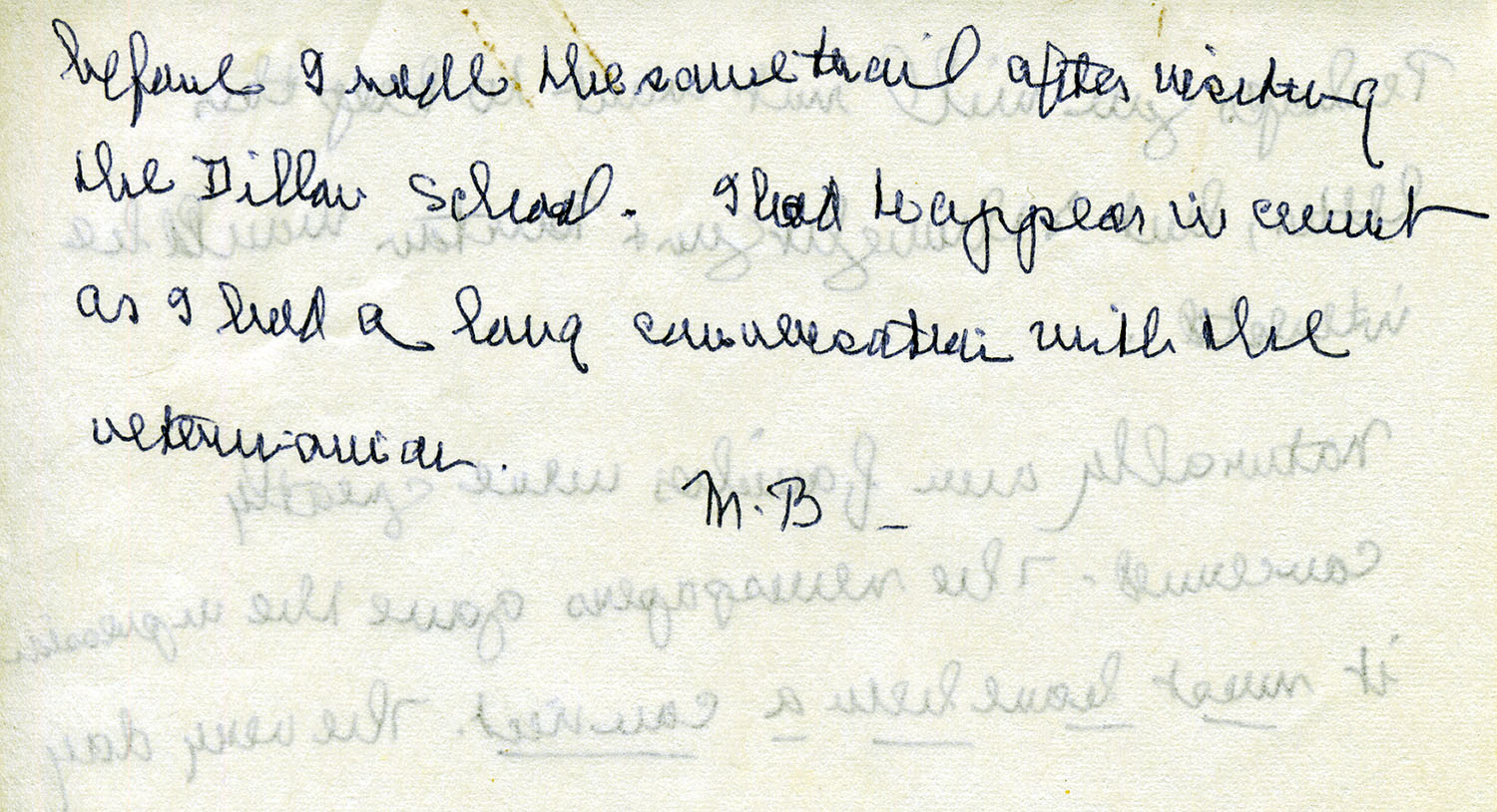 Perhaps you will not want to keep this letter, but I thought you and Burton would be interested. Naturally our families were greatly concerned. The newspapers gave the impression it must have been a convict. The very day before I rode the same trail after visiting the Dillon School, I had to appear in court as I had a long conversation with the veterinarian. M.B.